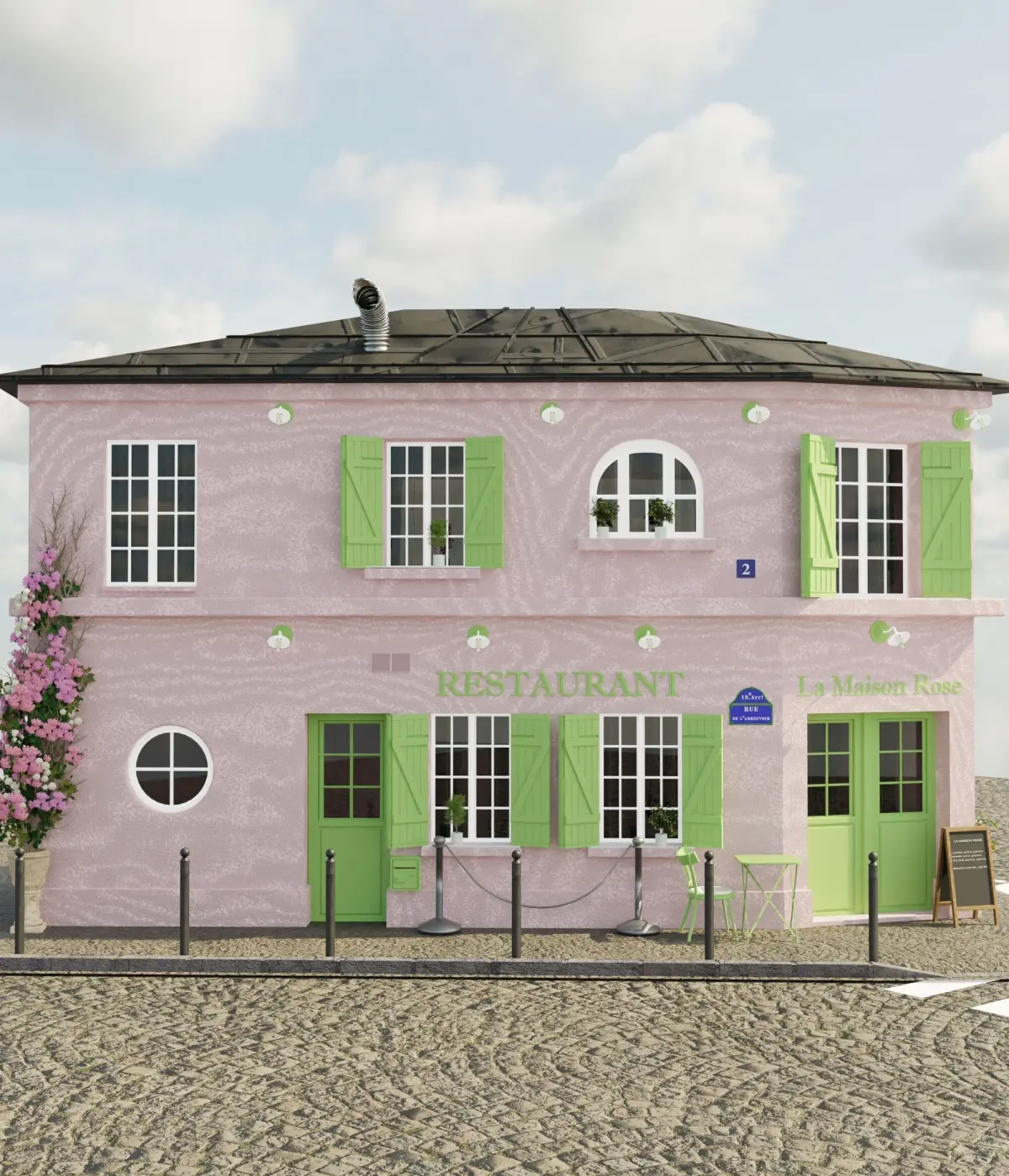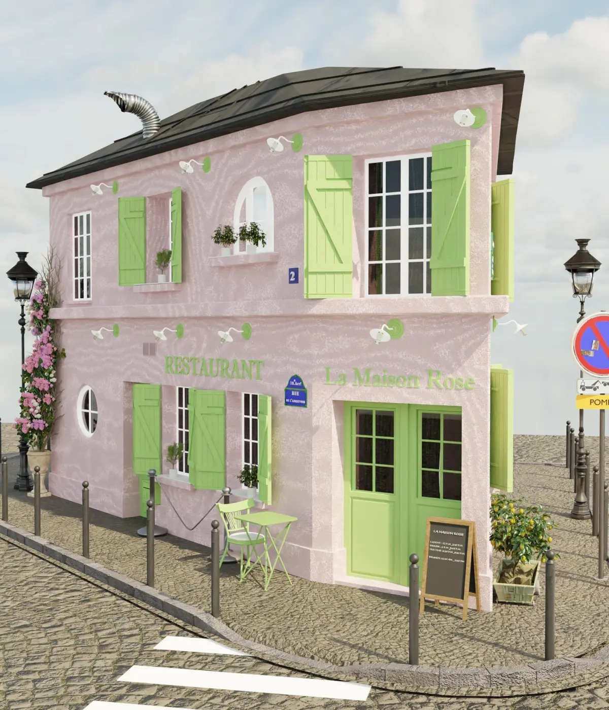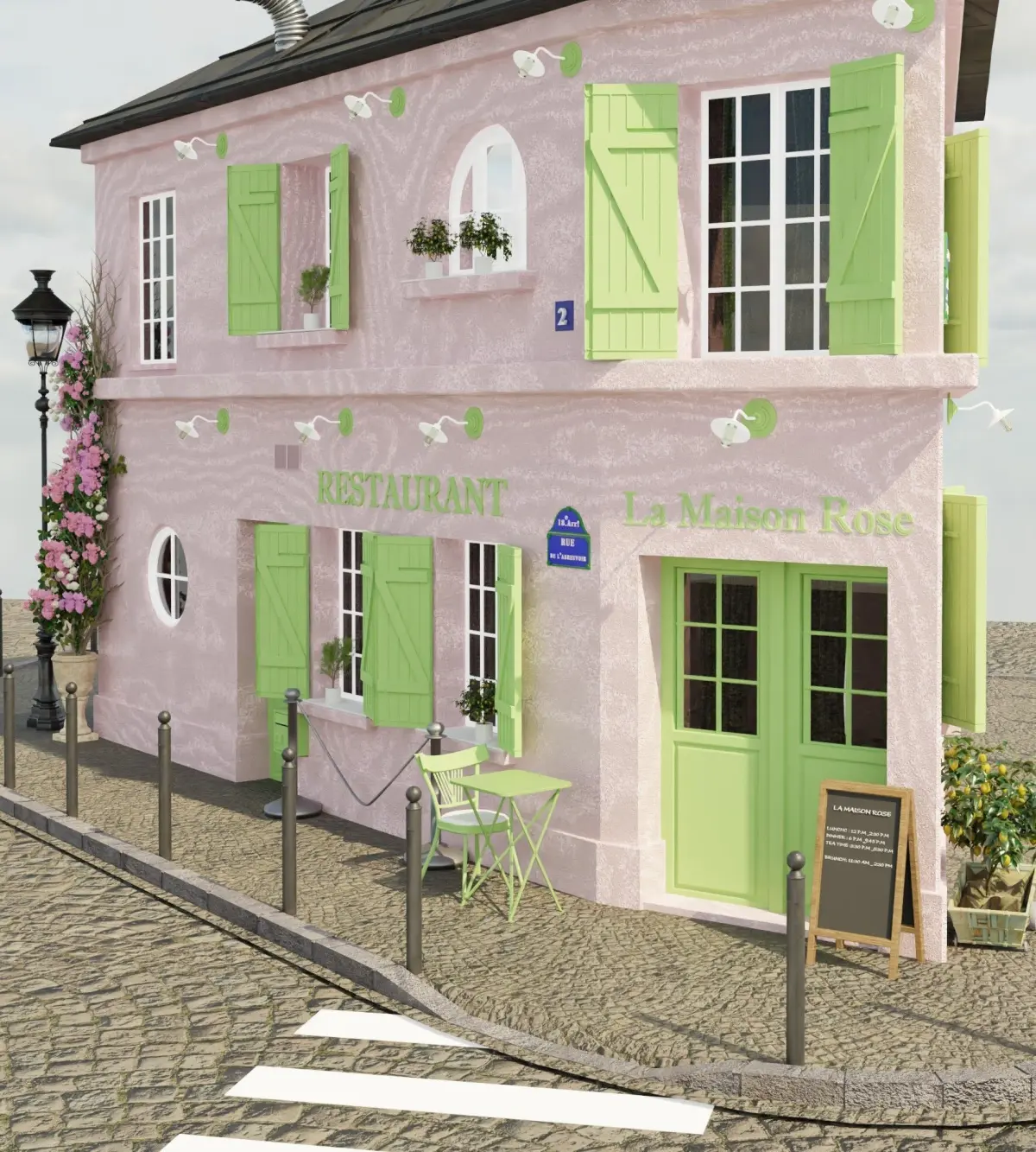 model info (dimensions)paris la maison rose restaurant length :15.81 mwidth: 13.28 mheight:6.8 mcolors: pink & greenmaterials:woodparis la maison rose restaurant has full uv and unwraping.