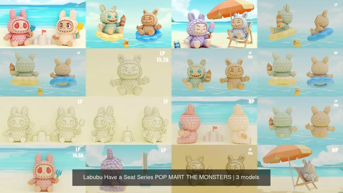 Infuse your digital creations with the ultimate delightful charm of a sunny beach day with this meticulously crafted and comprehensive 3D model set, featuring a full lineup of adorable characters from the beloved POP MART THE MONSTERS - Have a Seat Series: QUQU (mint), SISI (light beige), DADA (pink), BABA (beige), HEHE (grey), and ZIZI (light purple), all ready for seaside adventures with their extensive collection of beach gear. This ultimate charming collection perfectly captures the whimsical, collectible art toy aesthetic, ready to add a massive splash of summer fun to any scene.