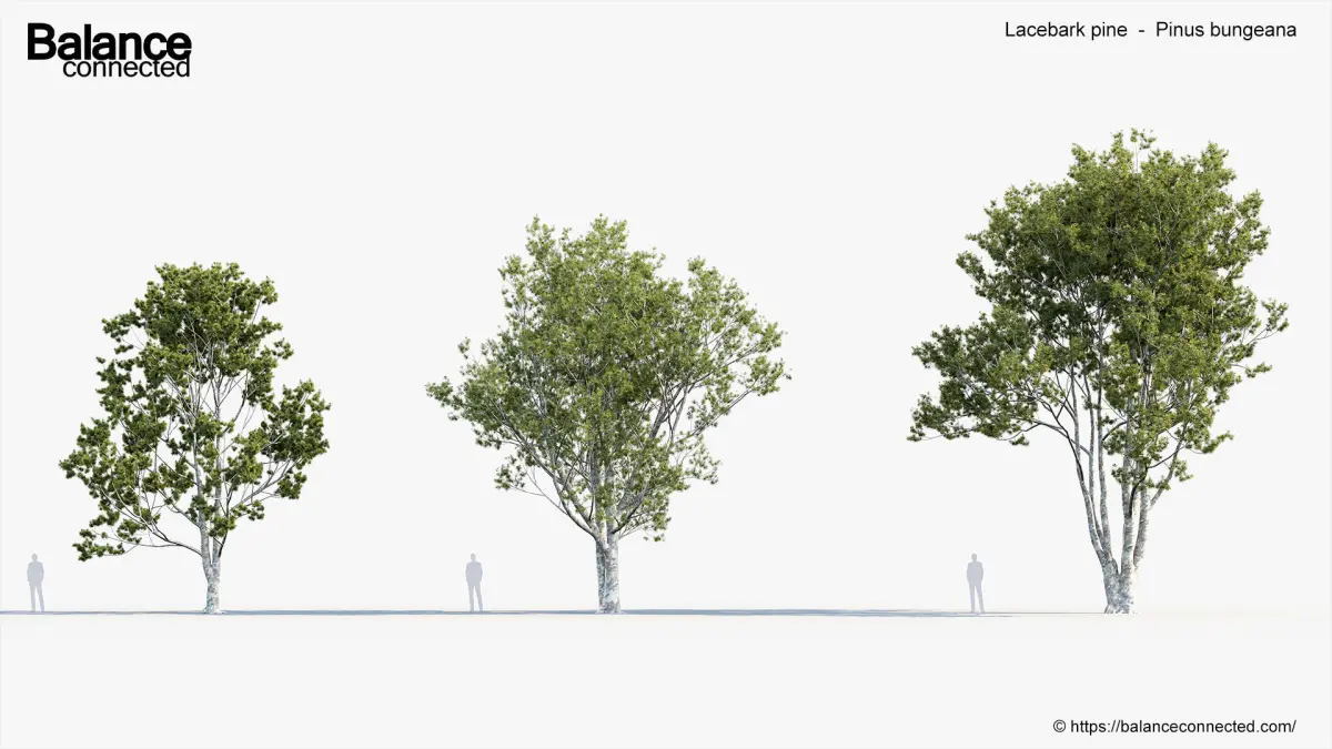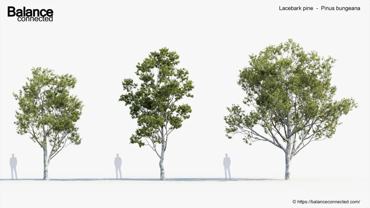 This product Lacebark pine - Pinus bungeana includes 6 unique 3D model variations with different heights, ages and forms of the species available for your production needs. We are sure our 'ready to import and render' products will help you with production efficiencies and effectively.