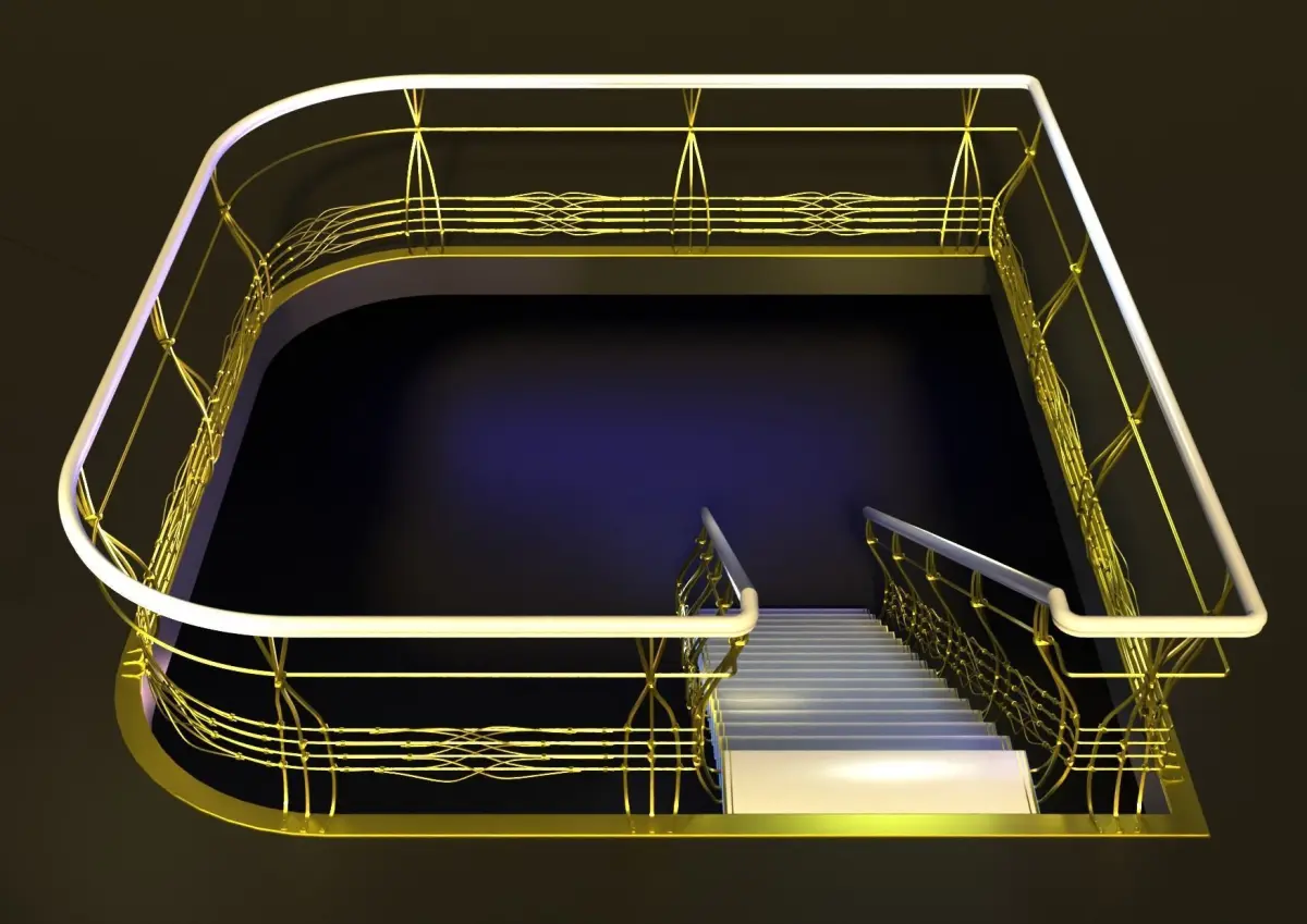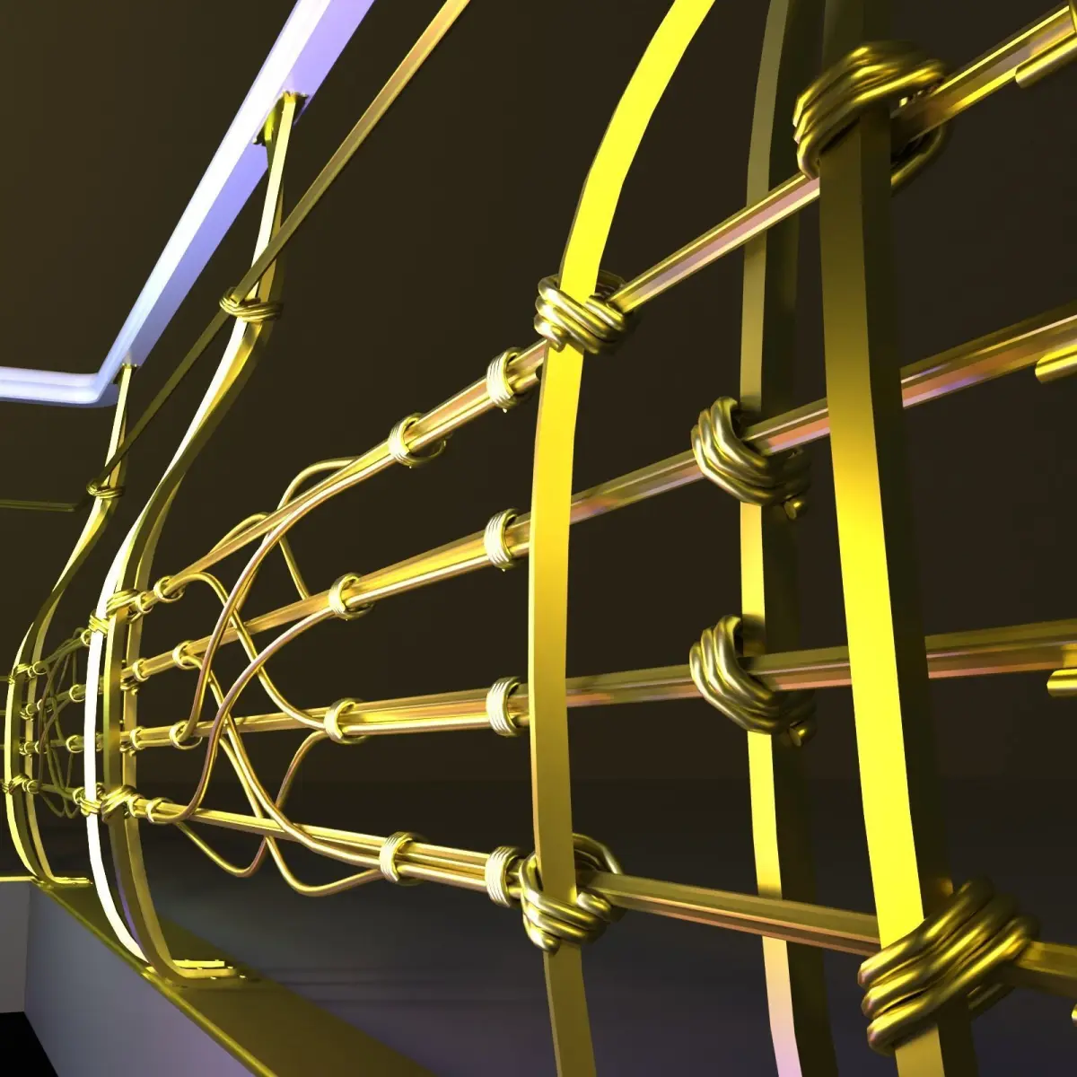 White staircase with golden metal balustrade. All parts have a smooth surface without textures, only blender materials.Upper level height 3060 mm, pitch 270*180 mm.The floor of the 2nd floor is preserved in the model, use it.The ornate forms of the stairs make it possible to use the model for various purposes.Available in blend, dae, obj, x3d, stl, abc, glb, usdc, fbx formats.