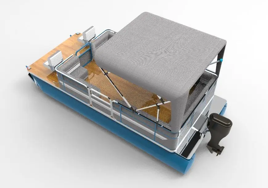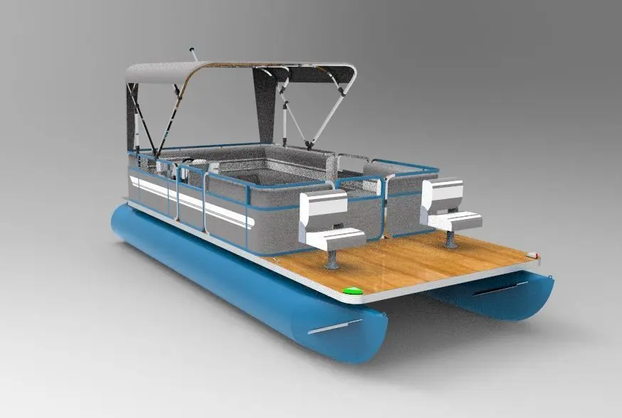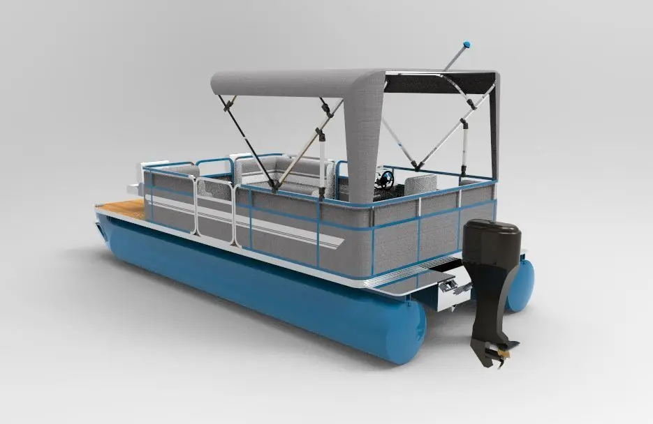 The 3D model design of a lake pontoon boat captures the unique structure and functionality of these versatile watercraft. The model showcases a stable, wide platform supported by twin or triple pontoons that provide exceptional buoyancy. The spacious deck is designed with ample seating and space for various activities, with detailed features like comfortable cushioned benches, a pilot's console, and a sturdy railing for safety. There's often a retractable canopy to provide shade, and the deck layout can include additional elements like a table, storage compartments, and even a small kitchenette for extended outings. This 3D model accurately represents the balance of leisure and practicality, illustrating why pontoon boats are popular choices for relaxed days on the lake.