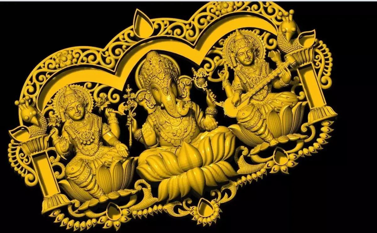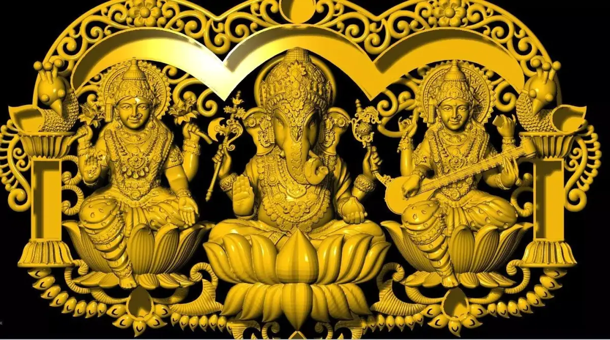 This is a high-quality 3D model of Lakshmi, Ganesha, and Saraswati beautifully crafted in intricate detail. The design is ideal for jewelry manufacturing, CNC carving, 3D printing, and ornamental decor.