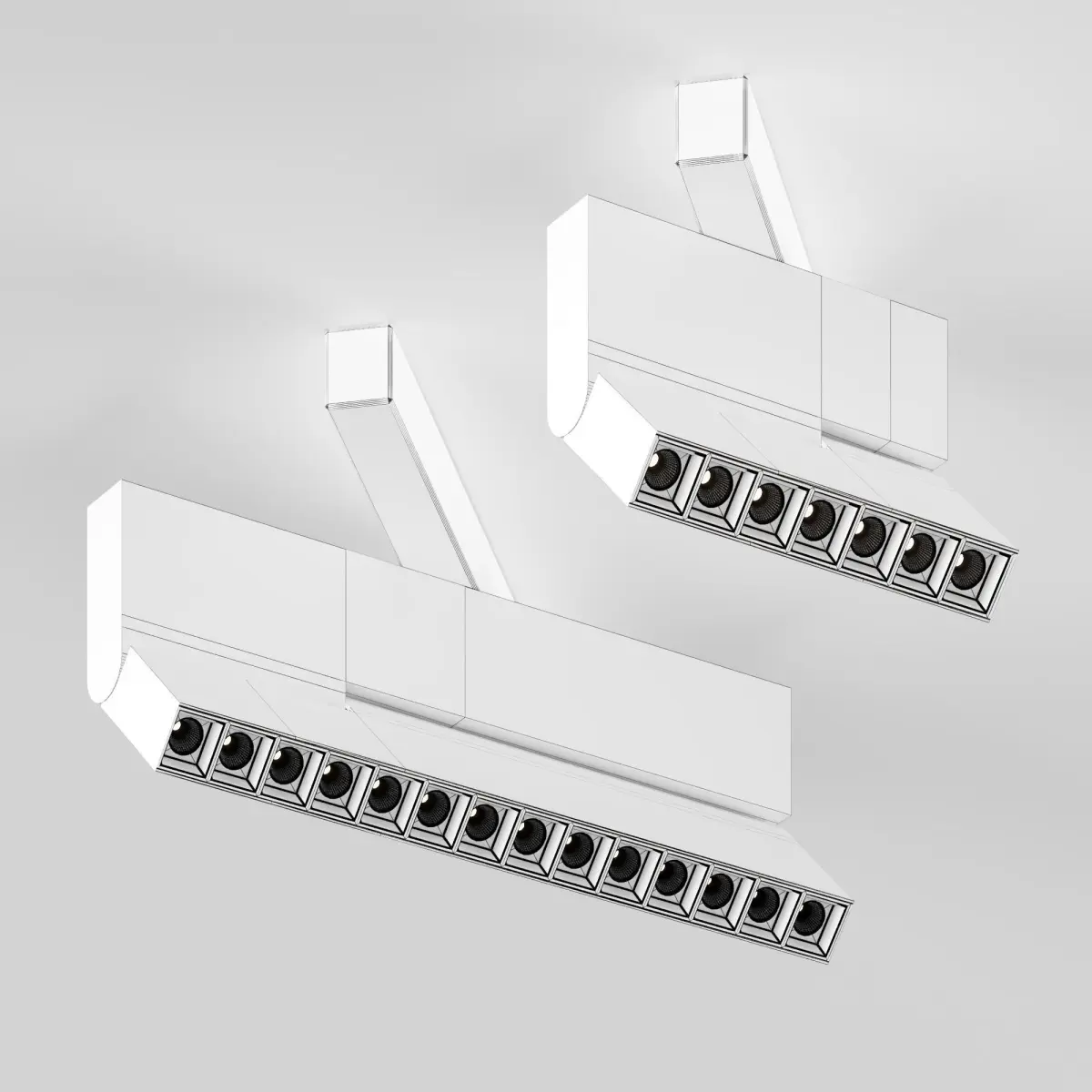The swivel mechanism of the linear luminaire allows tilting the fixture within 135° and 180°, directing the light in the desired direction. The luminaire is available in black and white colors.