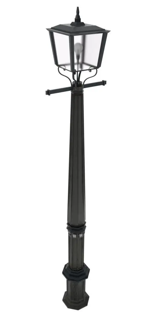 Lamp Post (Low Ploy), a common source of light in public scenery is designed with a unique early 20th Century style that you would find in the streets of London. This model is supports low-end hardware and is be used commonly in a game environment.
