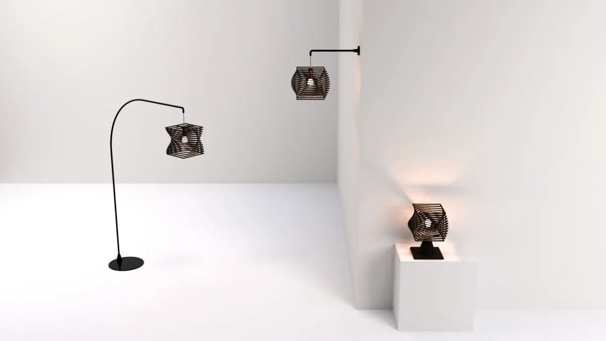 A 3D model of a 3-piece set of floor lamp, table lamp, and wall lamp.