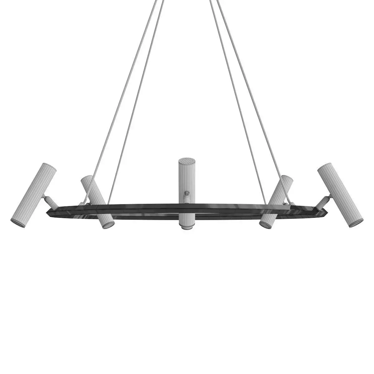 This is a high-quality 3D model of the Lampatron Leeds Ring chandelier, a bold and functional lighting fixture that blends modern design with an industrial aesthetic. The model accurately captures the lamp's unique design, featuring a large circular ring frame with a series of adjustable, cylindrical spotlights mounted along its perimeter. This design offers both a strong visual presence and highly customizable illumination.