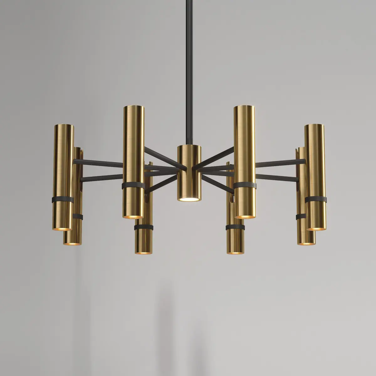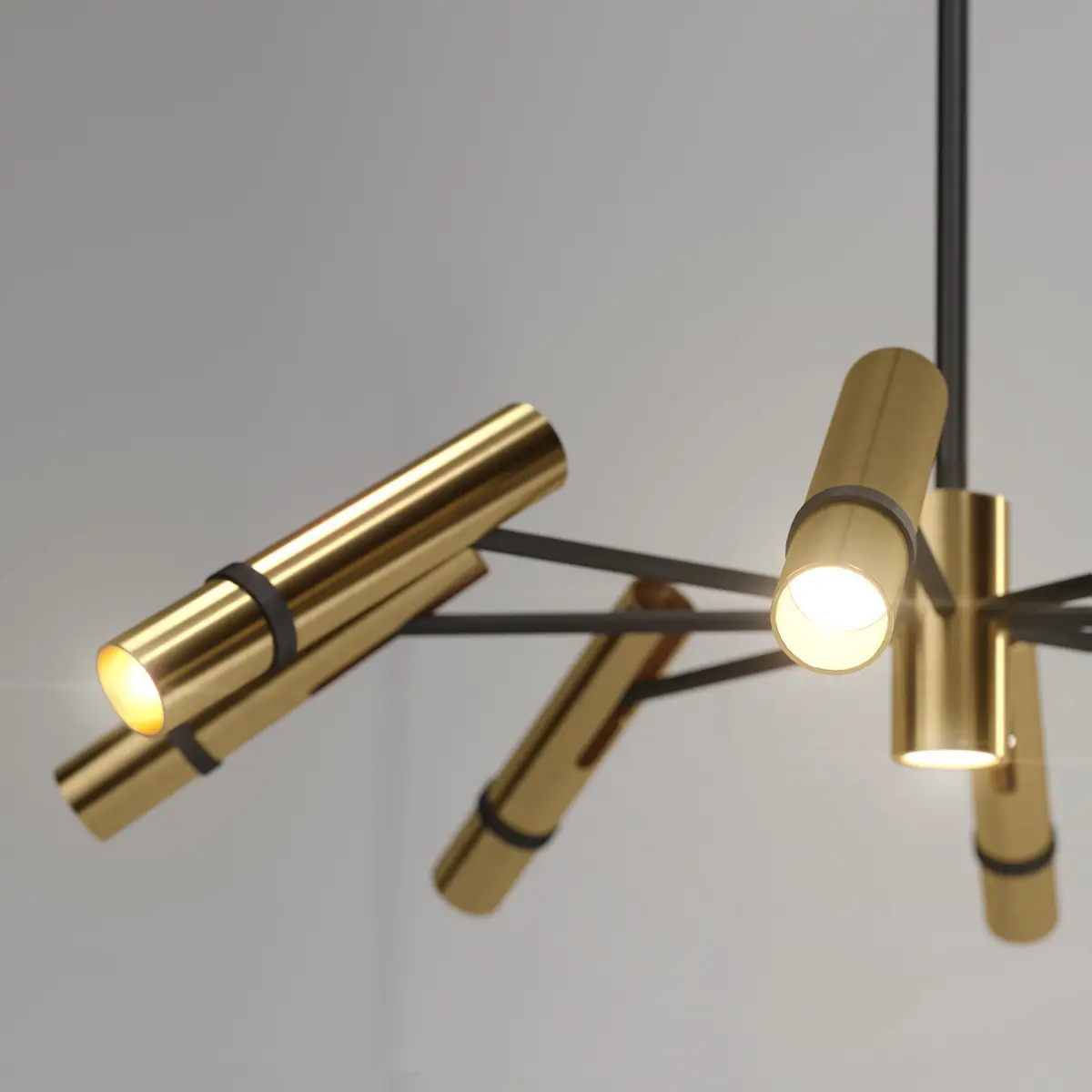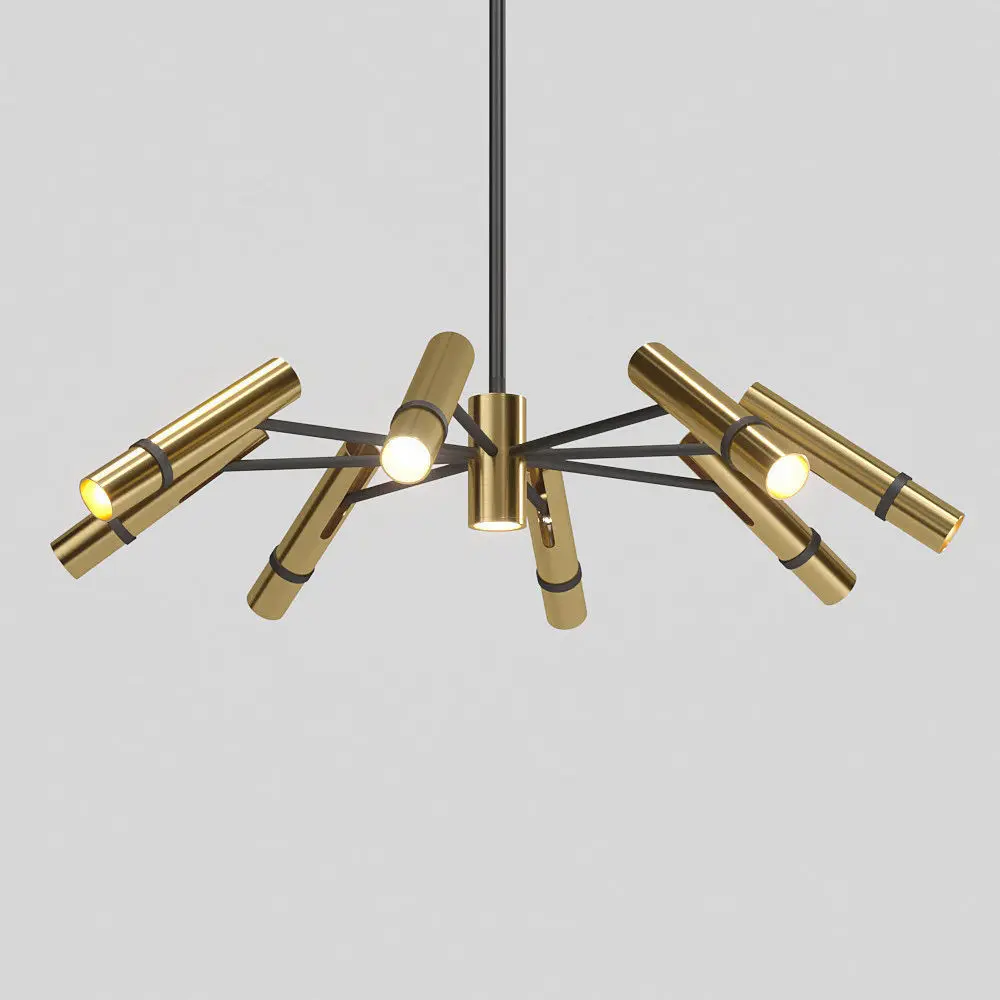 Contemporary designer chandelier with 9 lamps.3 configurations of lamps - rotation 0°, 20°, 45°.Models available in gold color.
