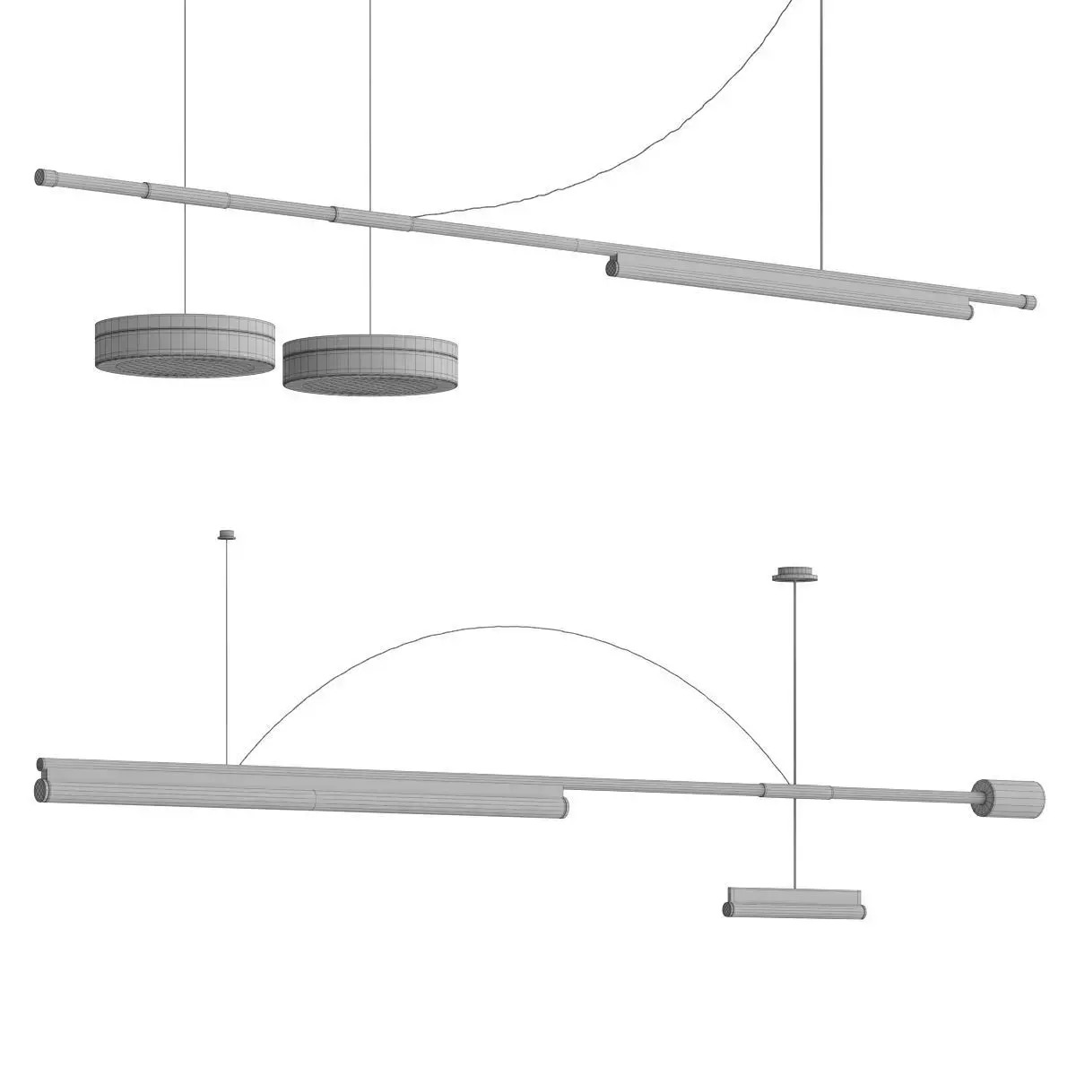 This is a premium 3D model of the Lampatron ZODIAC ARCH chandelier, a truly unique and artistic lighting fixture. The model accurately captures the lamp's unique design, which features a prominent horizontal bar from which a series of gracefully curved wooden or metal elements are suspended. The design is both playful and sculptural, creating a beautiful contrast between the rigid lines of the frame and the soft, organic curves of the light elements.
