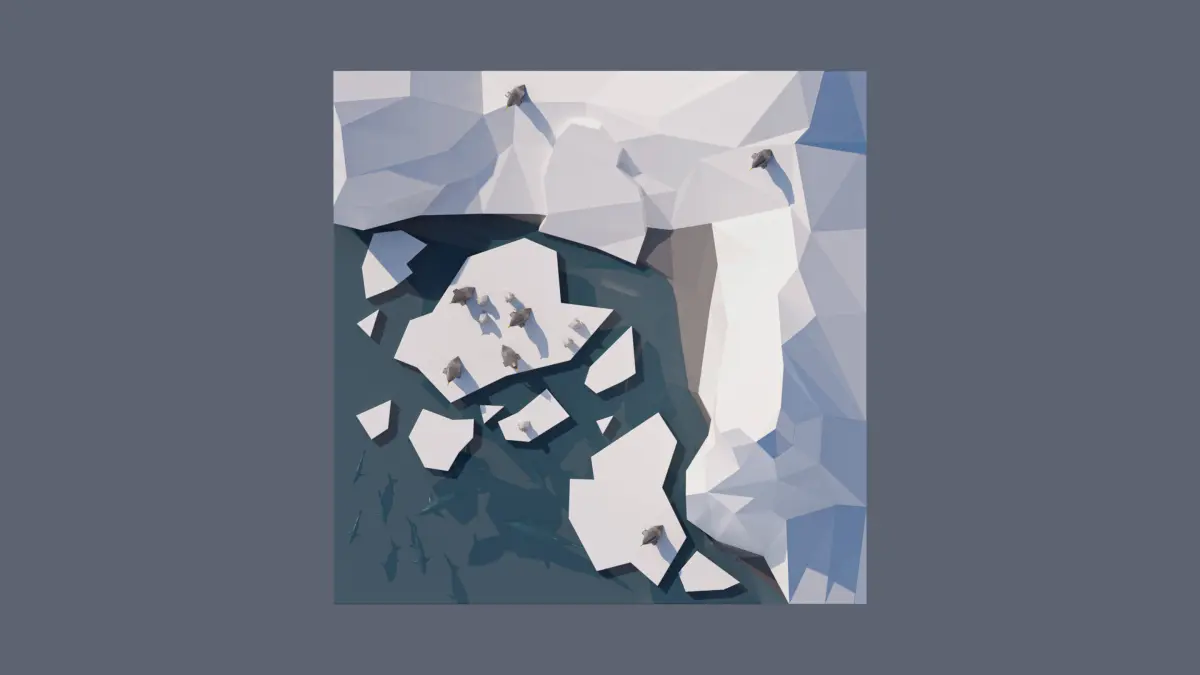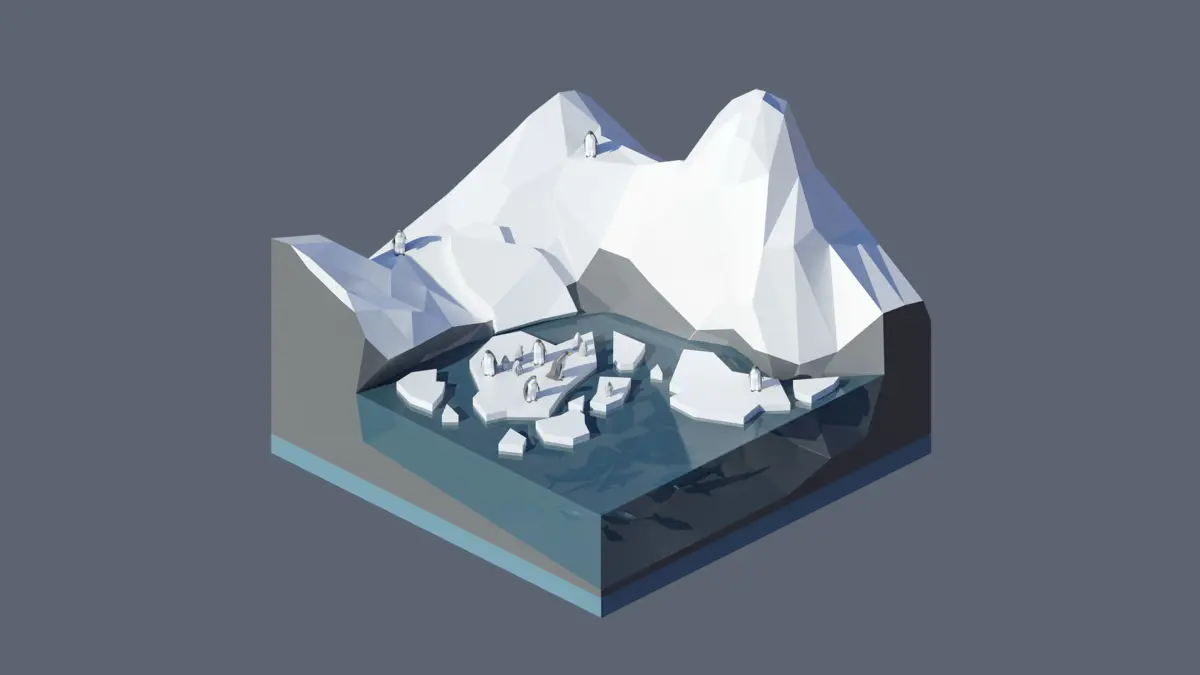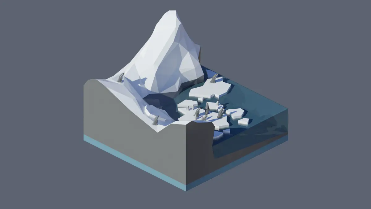 - landscape, ice cliffs, ice blocks, penguins, ocean.
