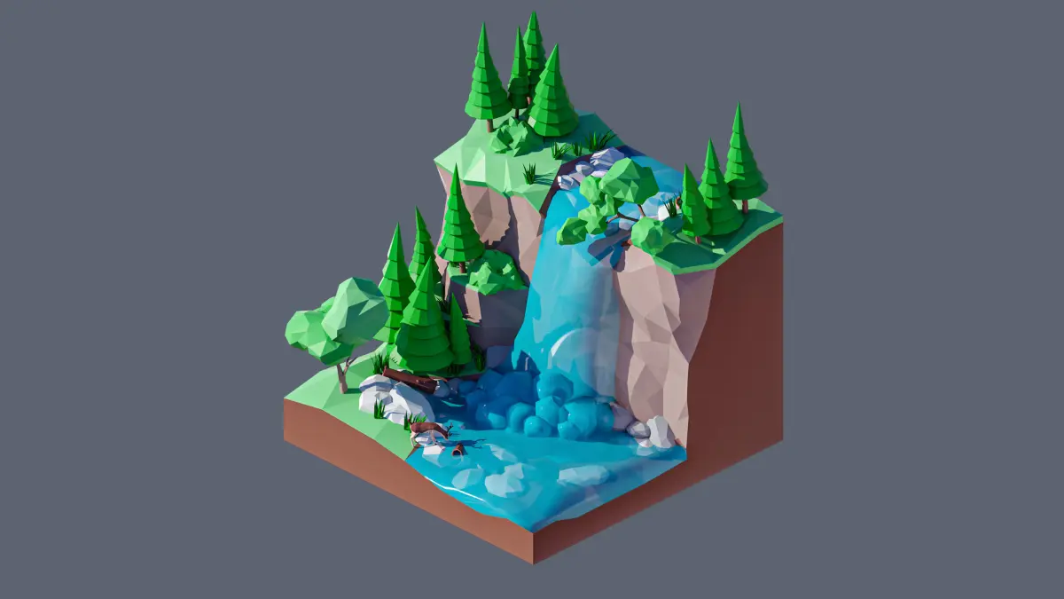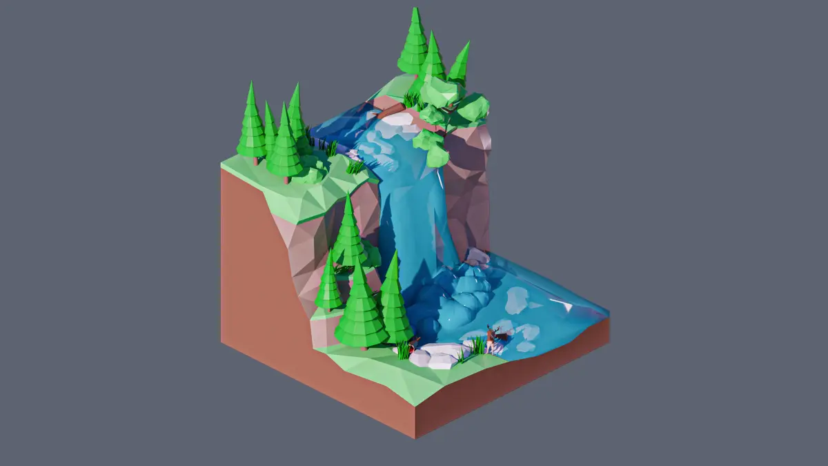- landscape, waterfall, trees, spruce, stones, bushes, rocks, log, deer.