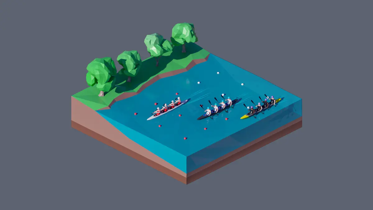 - landscape, lake/river, competition, canoe, people, athletes, paddles, trees, grass.