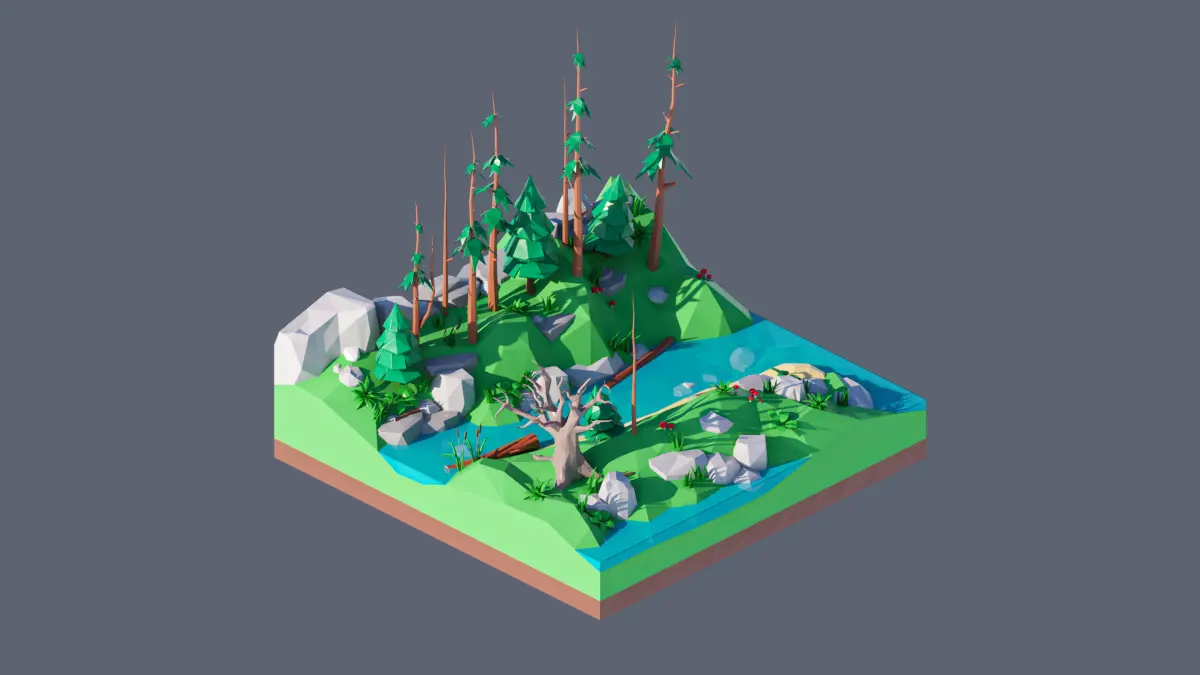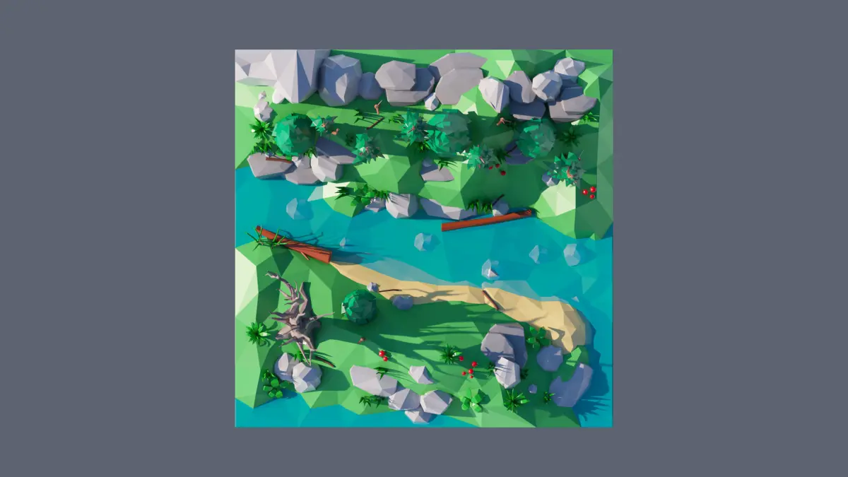 - landscape, stones, river, log, trees, spruce, grass, bushes, mushrooms, dried tree.