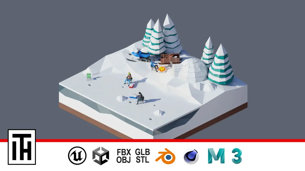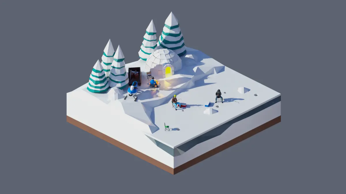 - landscape, snow, ice, snow house, igloo, people, chairs, trees, spruce, fishing boxes, snowmobile, campfire, fishing rods.