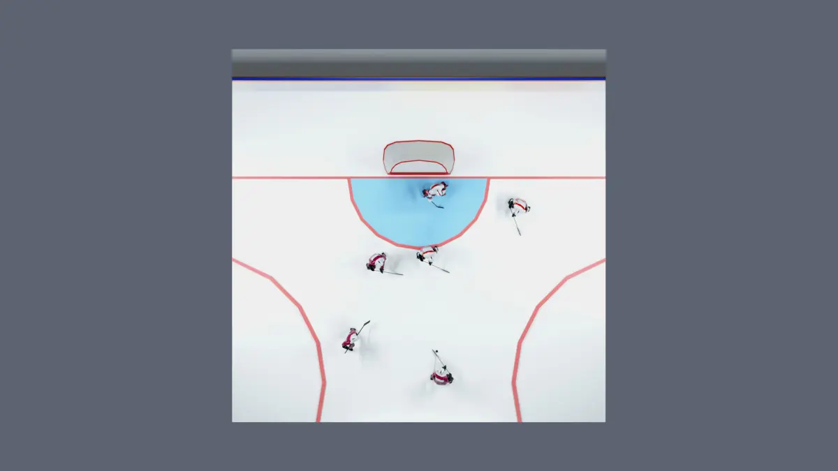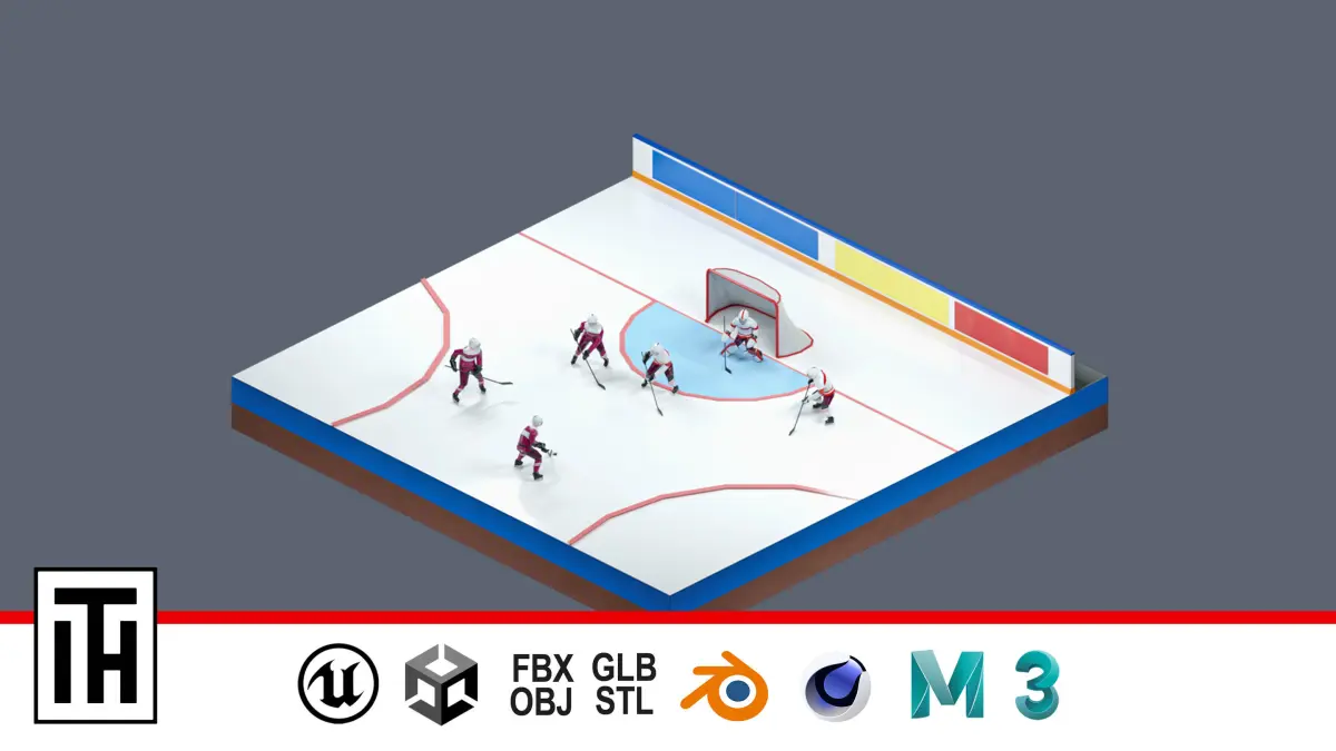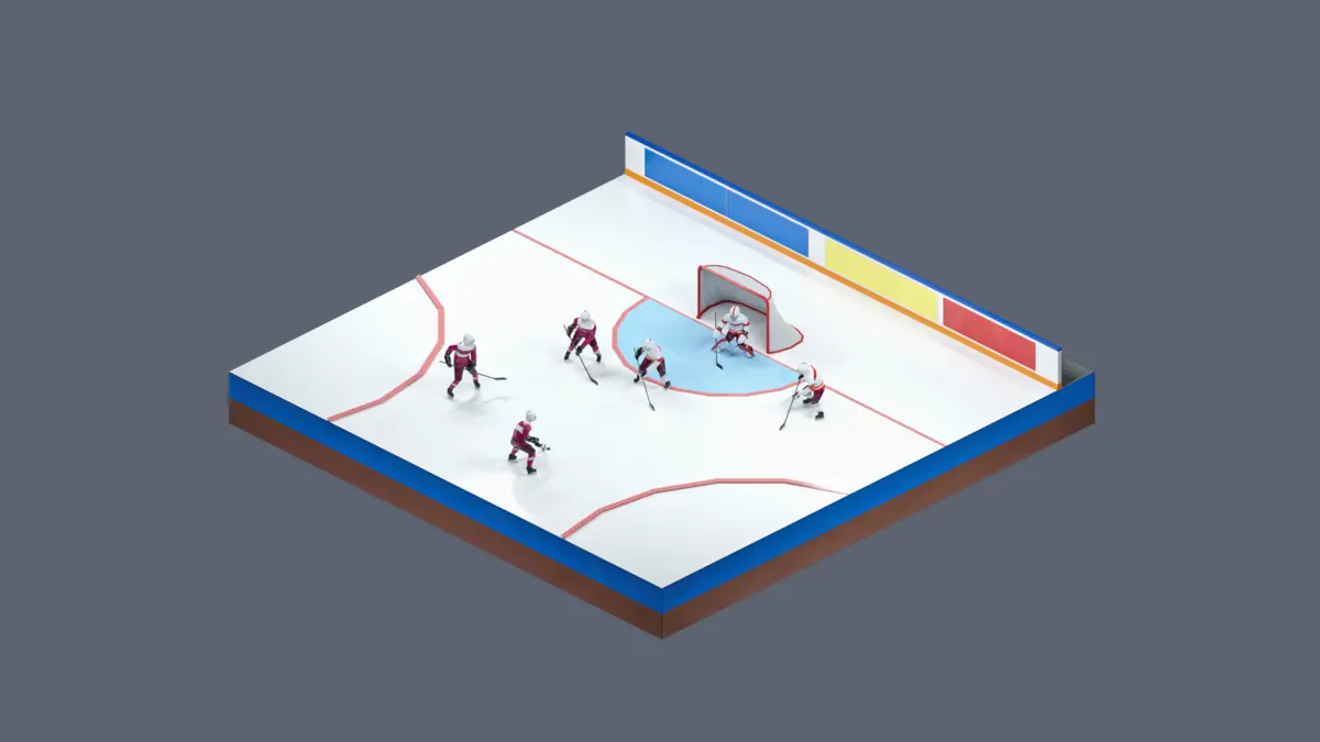 - landscape, ice arena, people, hockey players, sticks, puck, hockey goals.