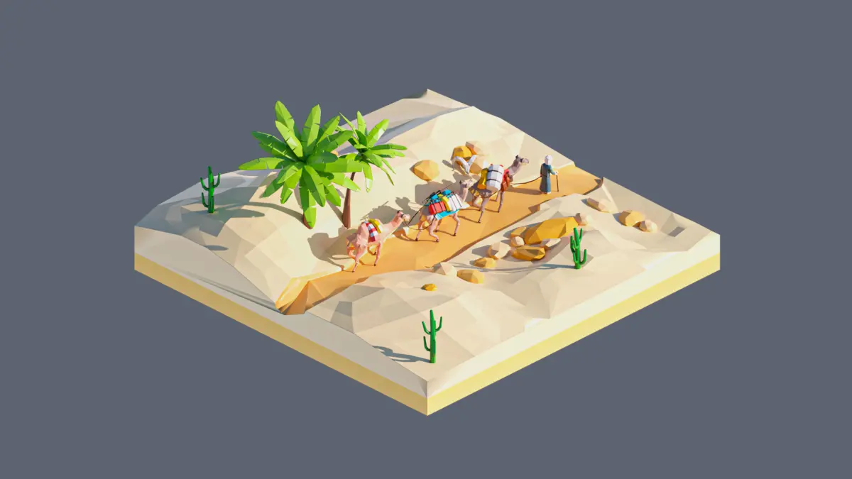 - landscape, desert, stones, palm trees, cacti, man, traveler, caravan, camels.