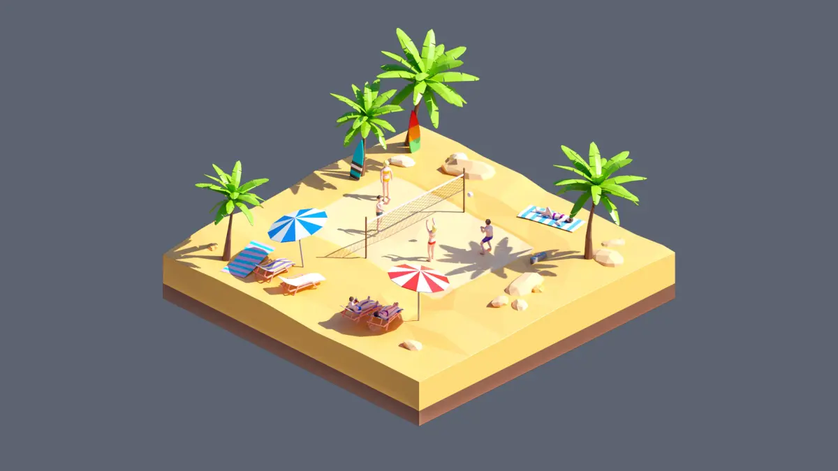 - landscape, beach, volleyball, people, vacationers, tape recorder, surfboards, palm trees, deckchairs, beach umbrellas, stones, volleyball court.