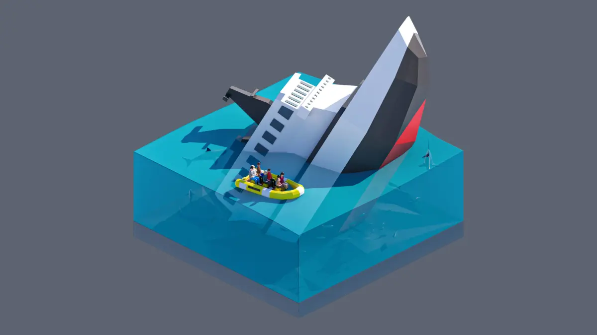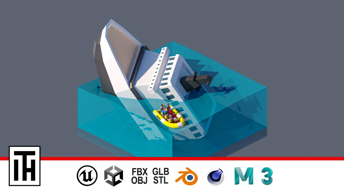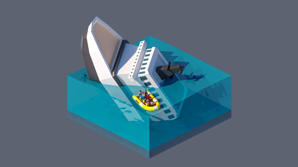 - landscape, sea, fish, sharks, shipwreck, rescue boat, human survivors.