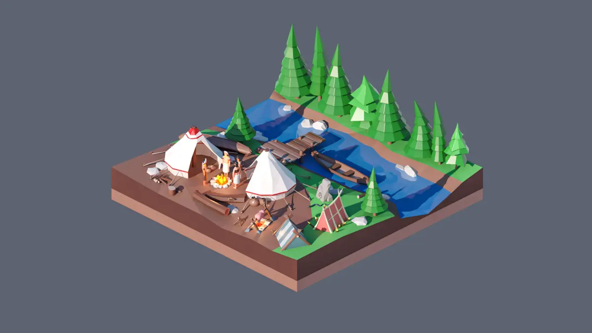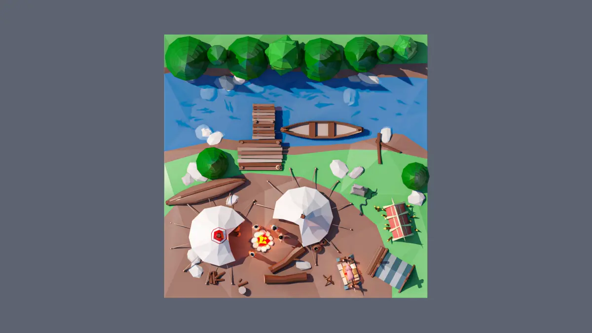 - landscape, river, trees, spruces, rocks, logs, firewood, campfire, tents, pitchers, boat, pier, snake, spit meat, people, Indian community.