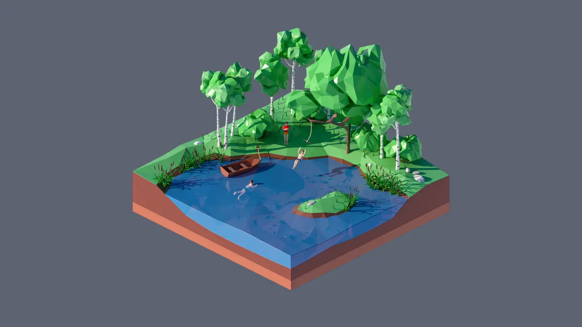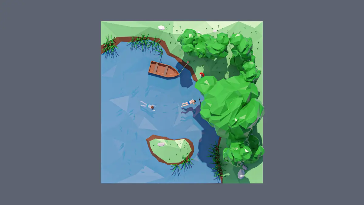 - landscape, outdoor recreation, trees, grass, reeds, lake, boat, people, rocks, bungee cord, fish, bushes.