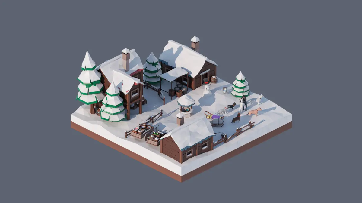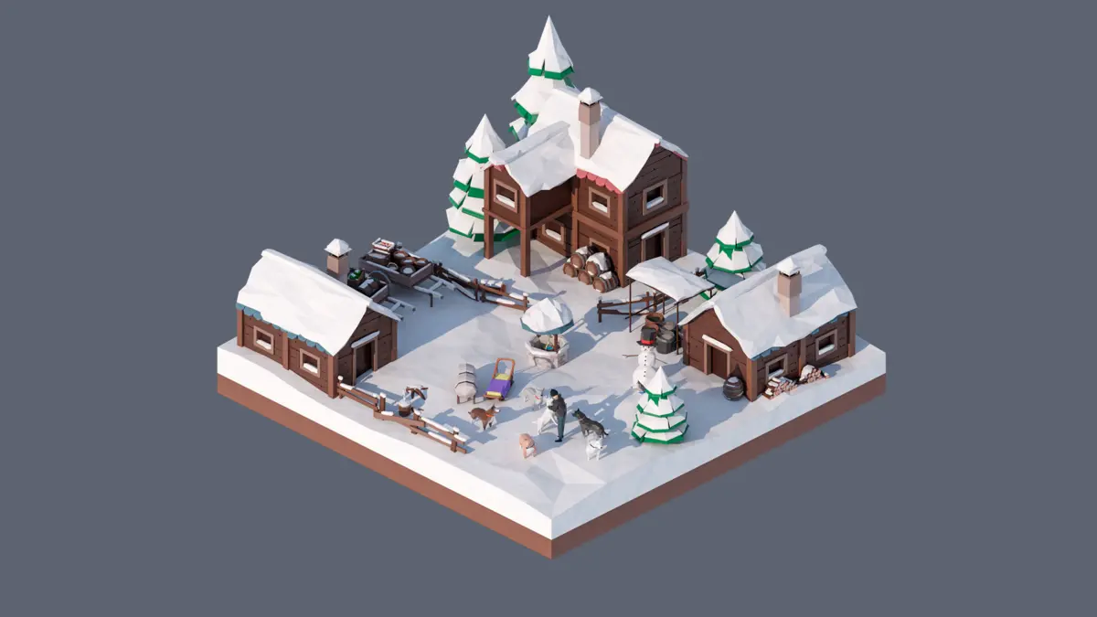 - landscape, house, tree, man, dog, well, wagon, dog sled, snowman, barrel, logs, sacks of grain, fence.
