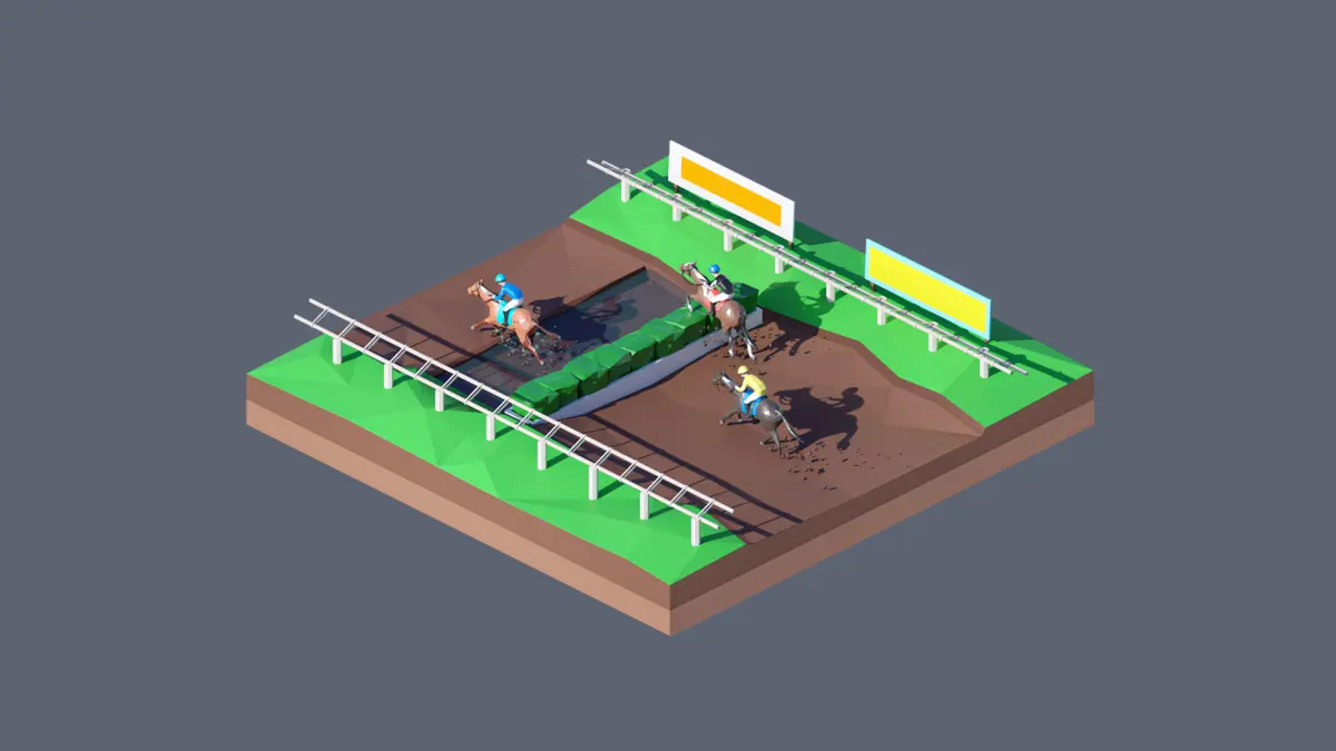 - landscape, racetrack, horse race, horses, people, athletes, grass, barriers, fences.