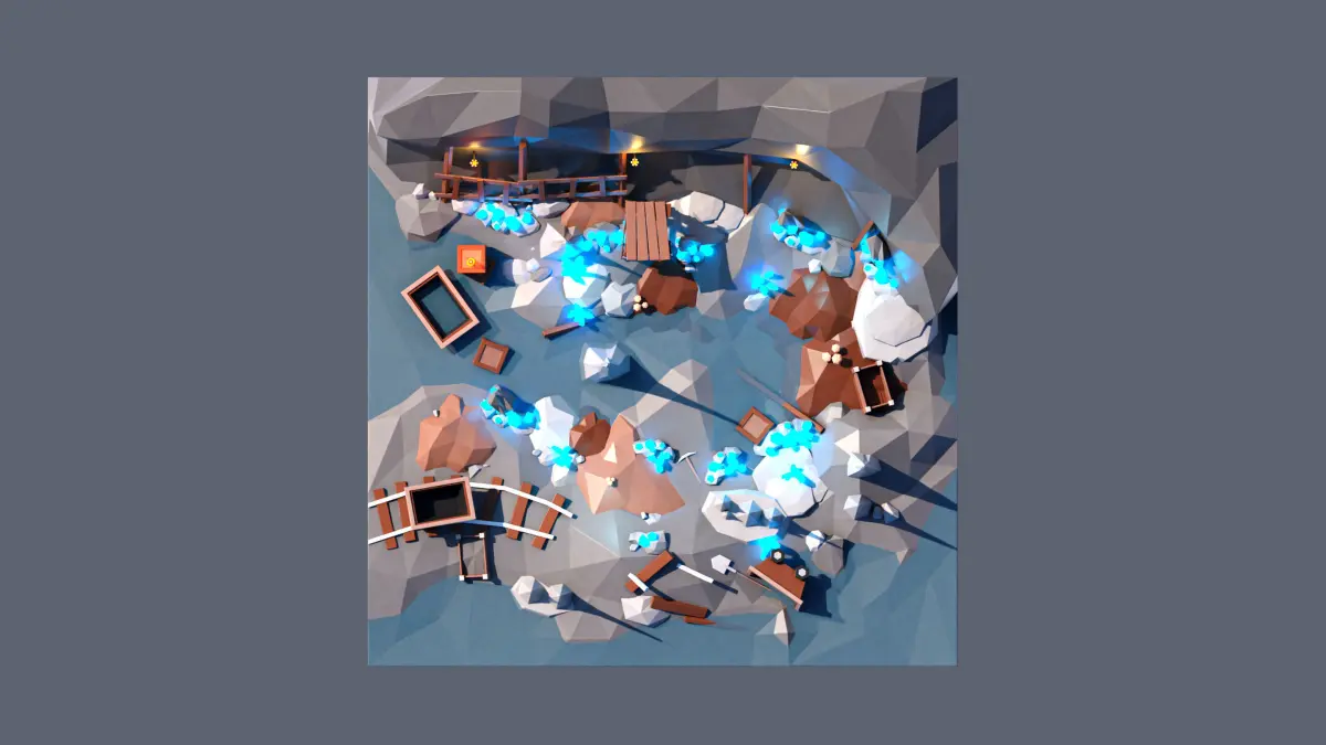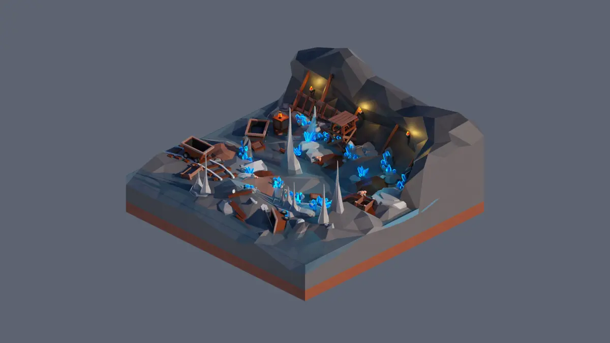 - landscape, dungeon, gemstone mining, rock, wooden crates, wagons, torch, lamp, sapphires, gems, emeralds.
