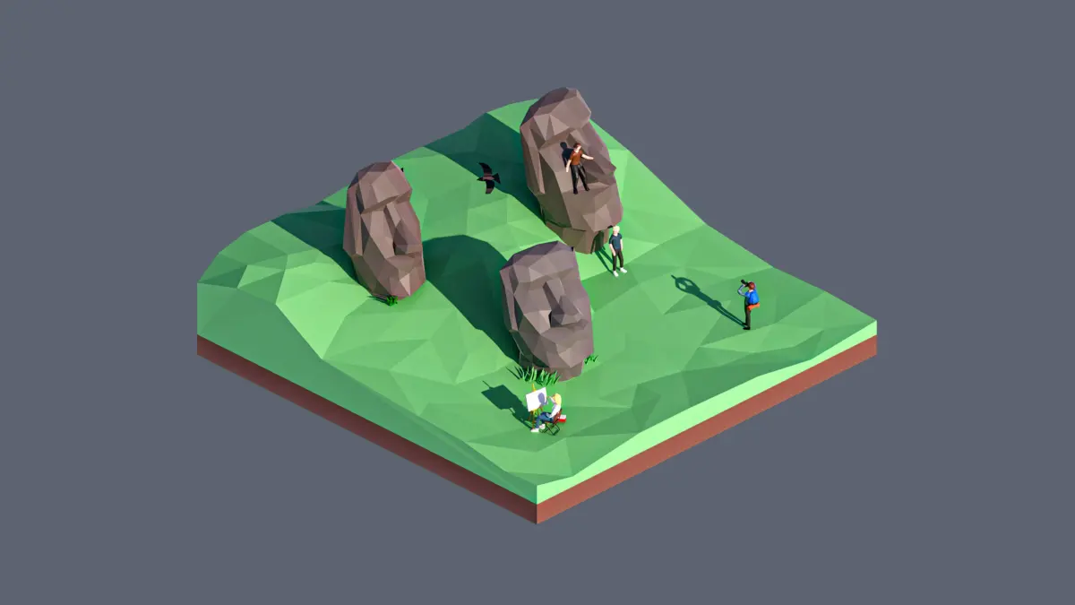 - landscape, Easter Island, plain, birds, people, photographer, artist, easel, paints, brush, stone heads.