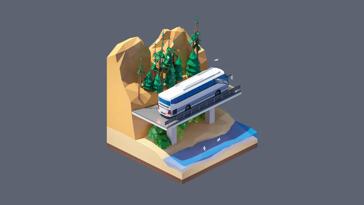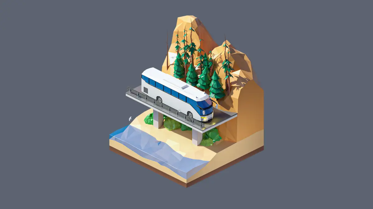 - landscape, tour bus, birds, lake, bridge, bushes, rocks, trees, spruces.