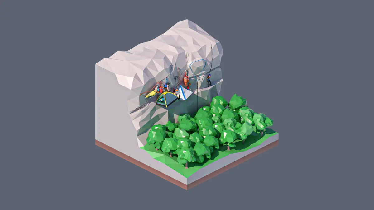 - landscape, mountaineering, rocks, grass, trees, climbers, climbing gear, tent, sleeping bags.