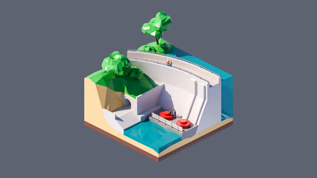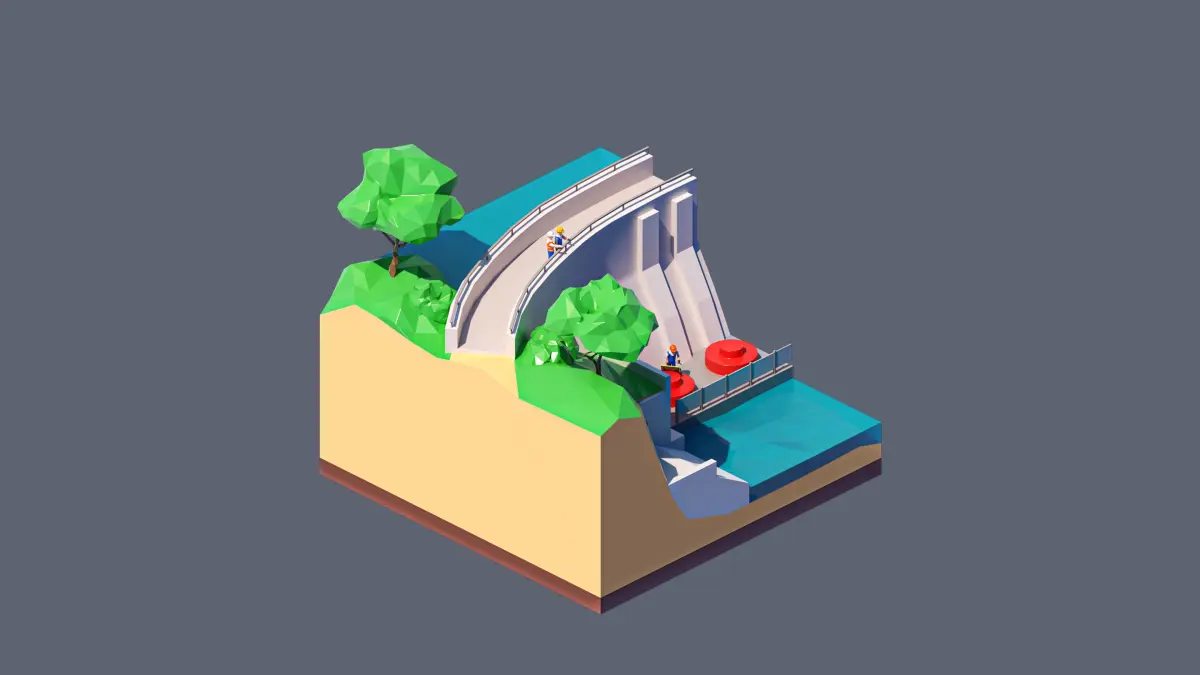 - landscape, dam, river, rock, trees, bushes, grass, dam workers, toolbox.