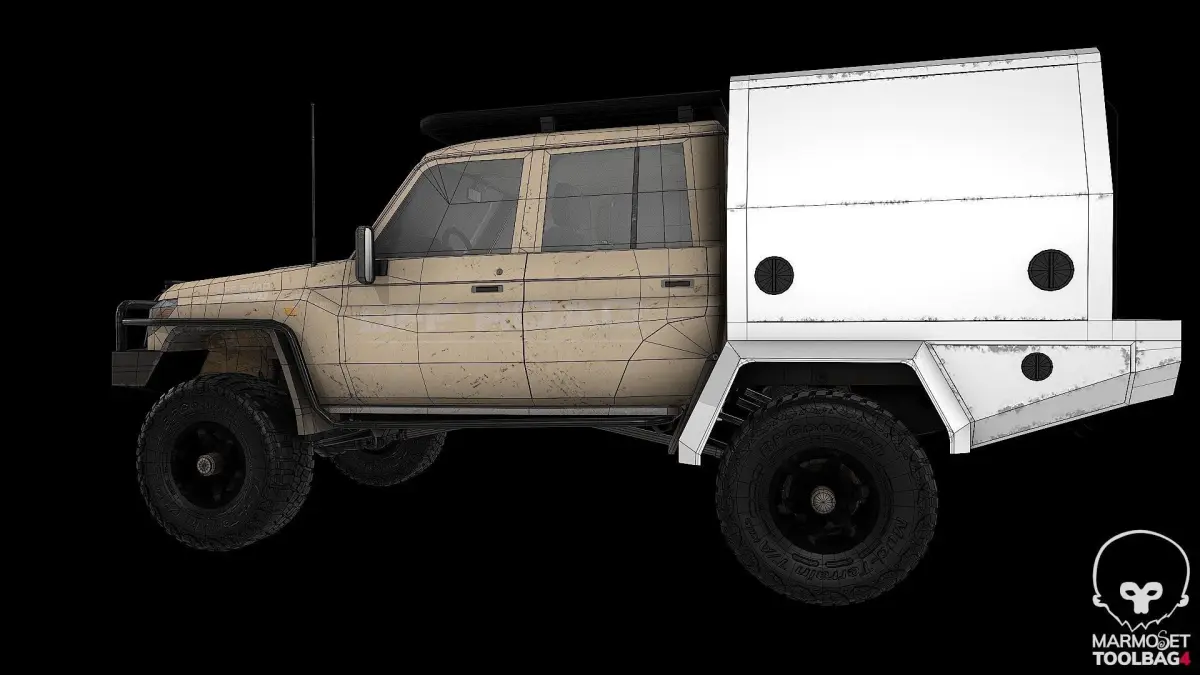 Hey guys ! Today I come with an upgraded version, low-poly and ready-to-rig Toyota Land Cruiser J79 Double Cab. This pickup is equiped with solid axles, both front and rear, with huge tyres, that's why this 4wd vehicle is made for the wild . For this purpose, I decided to replace or install :