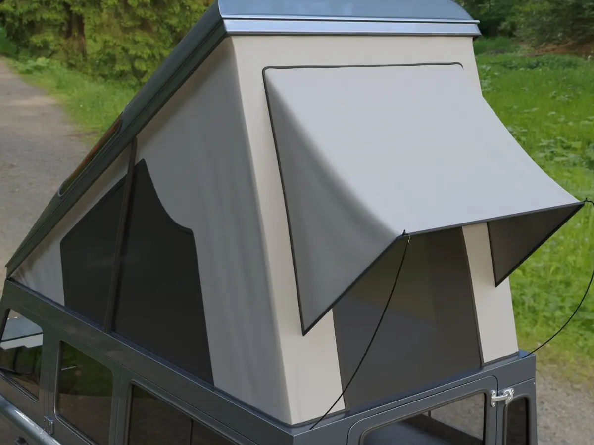 Land Rover Defender 110 Camper with the roof low and the roof raised with tent. Wheels and tires Dick Cepek.
