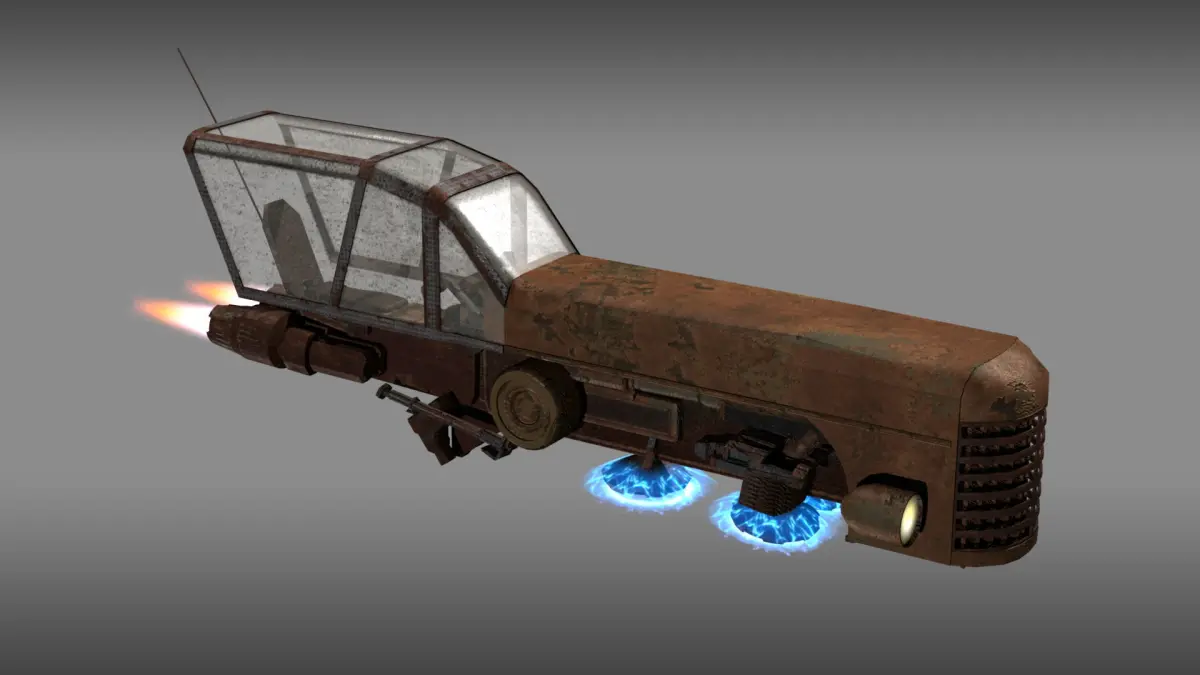 This is a steam styled hover craft. The model includes articulating kickstands and canopy. Hover effects and throttle controls.