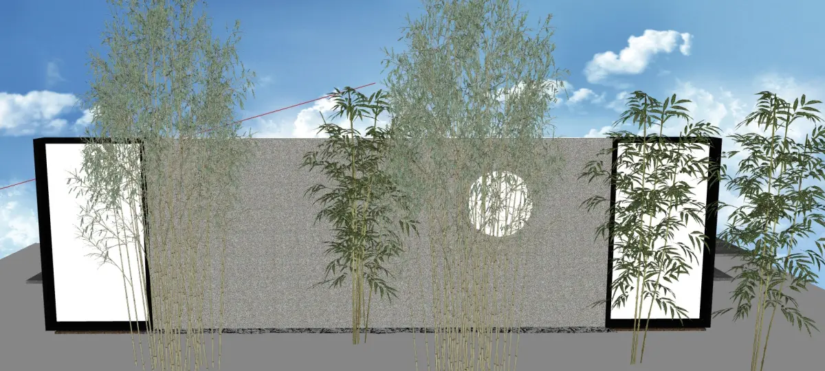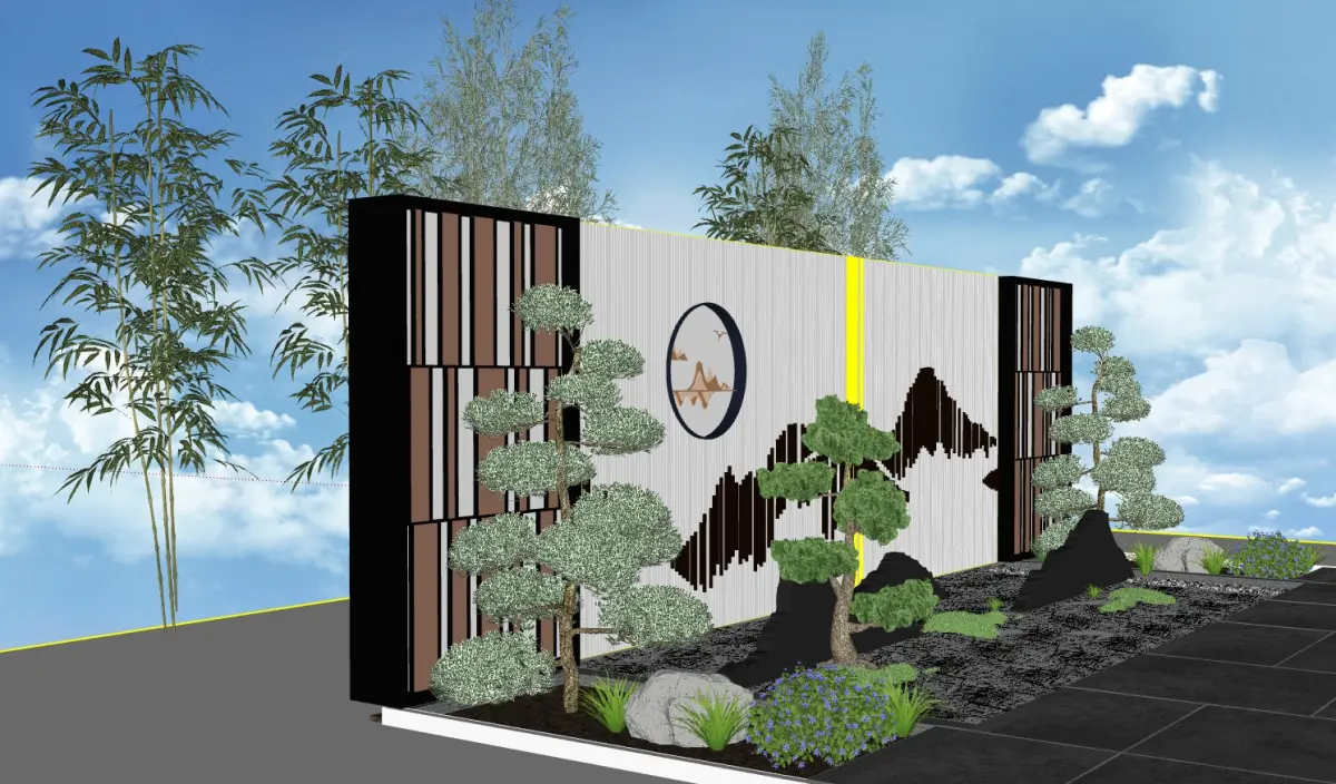 A strong sense of symmetry governs the layout, lending inherent order and calmness to the composition. However, within this framework, the organic forms of the plants and rocks introduce subtle natural variation, preventing rigidity. Every element – from the monumental wall art to the placement of the smallest stone – contributes to a unified visual narrative centered on peace, natural beauty, and refined cultural expression. The rendering successfully demonstrates a high level of biophilic design, seamlessly weaving together art, architecture, and nature to create a timeless, contemplative outdoor environment.