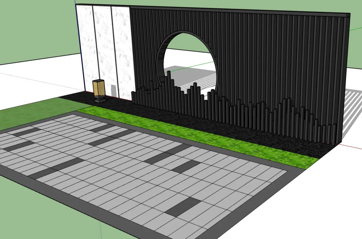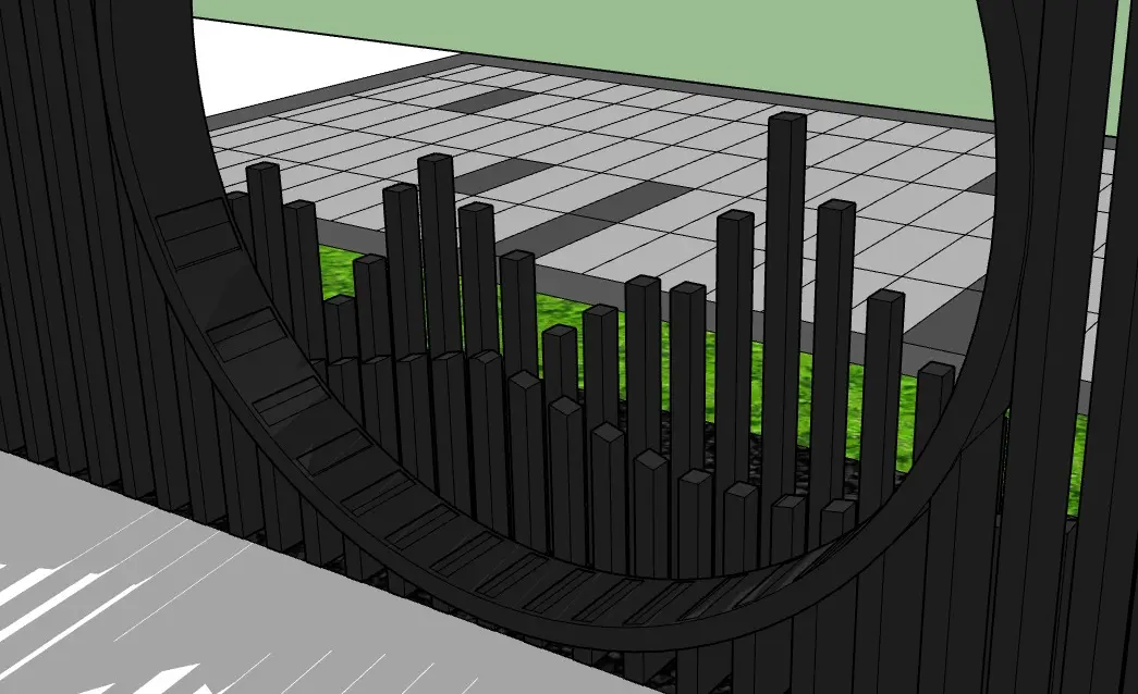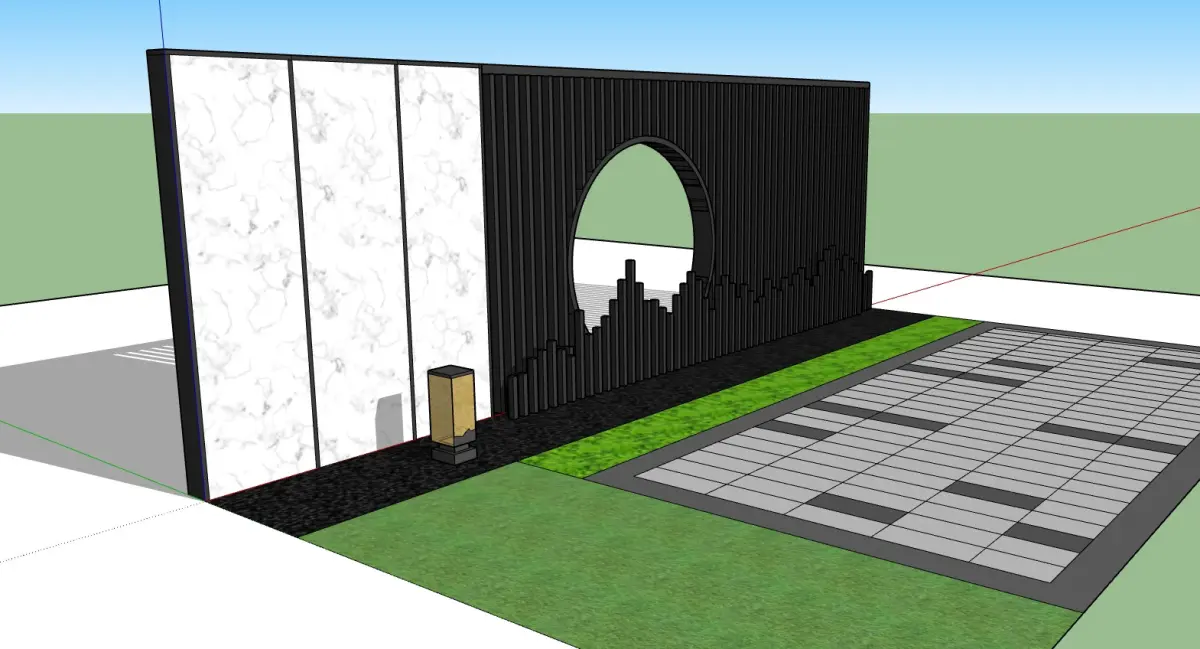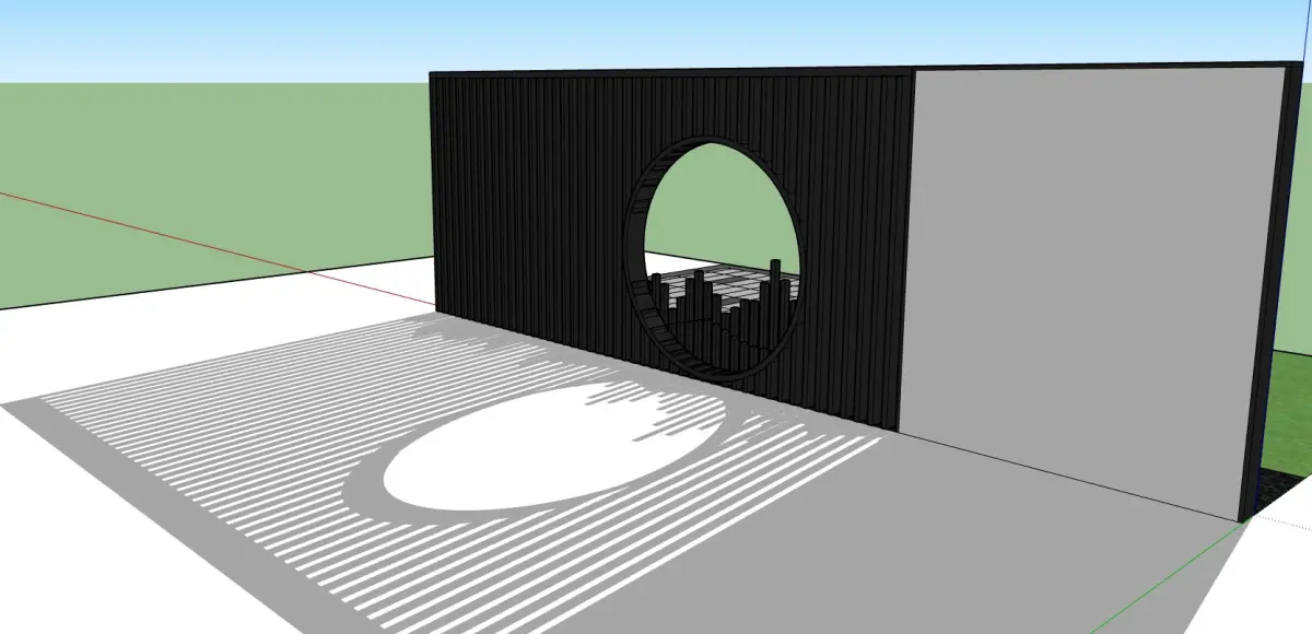 This contemporary landscape design rendering masterfully blends modern architectural elements with tranquil spatial composition. Dominating the scene is a dual-material feature wall: polished marble panels with dramatic natural veining create a refined, organic backdrop, juxtaposed against a bold black vertical slat screen. The screen's architectural significance is amplified by a strategically placed circular aperture that frames distant foliage, establishing a visual dialogue between interior and exterior spaces while enhancing spatial transparency.