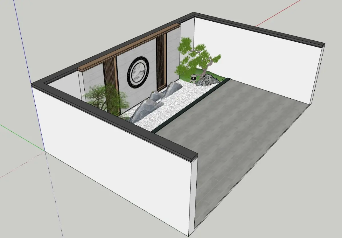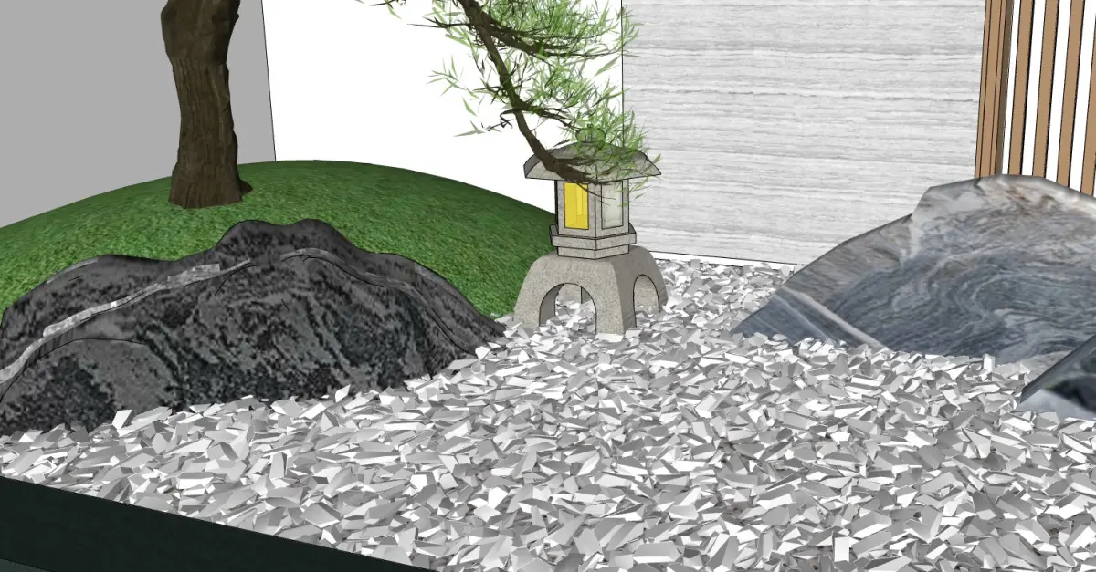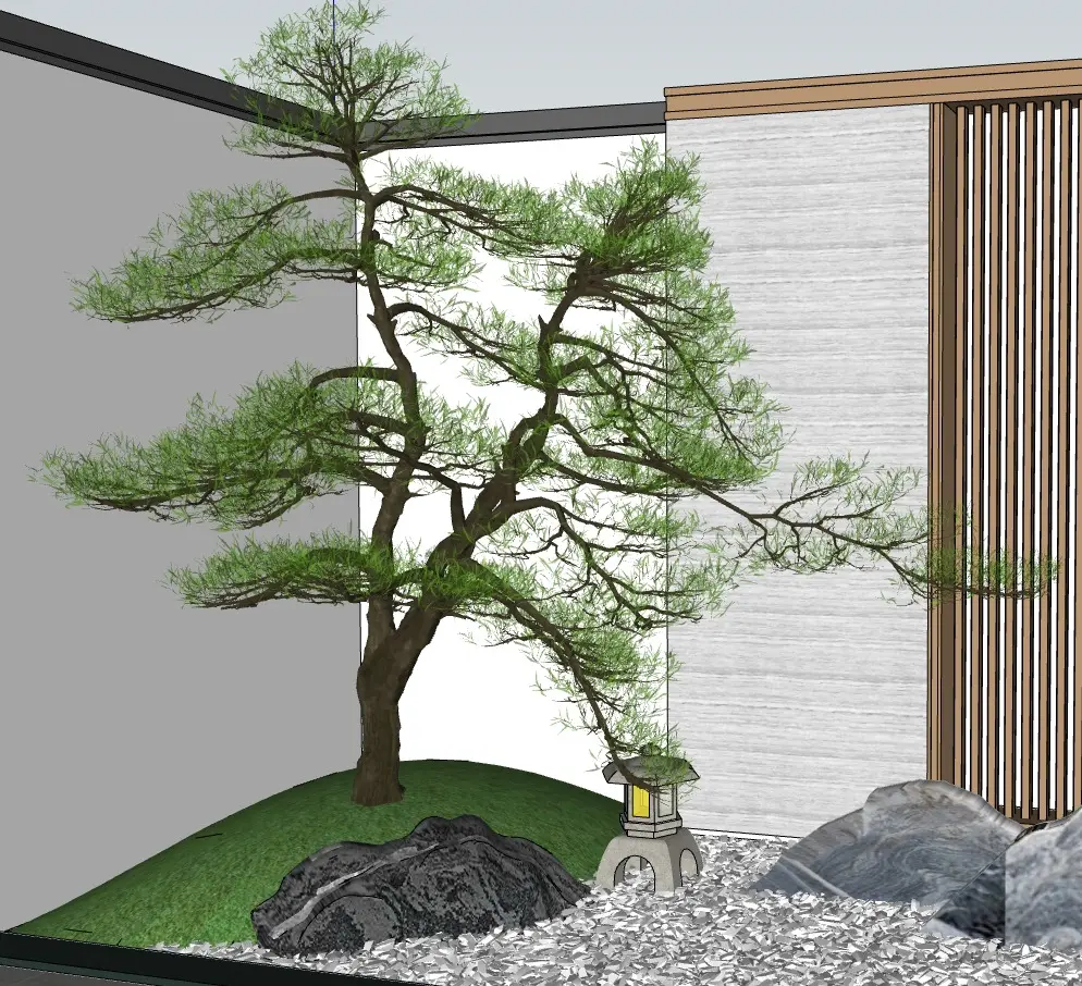 This Chinese Landscape Feature Wall masterfully blends traditional Eastern aesthetics with contemporary luxury. Inspired by Kanshan Jing (枯山景) dry gardens, the composition features sculptural mountain rocks emerging from a serene expanse of raked white gravel, evoking mist-covered peaks. Two artistically twisted pine trees frame the scene, anchored by antique-style bronze floor lamps that cast subtle illumination.The backdrop transitions seamlessly into modern elegance: honed marble panels juxtapose with vertical champagne-metallic louvers, creating a luxe textural contrast. A circular Chinese landscape painting – encased within concentric interlocked traditional motifs – forms the focal point, symbolizing harmony between humanity and nature.Executed in a sophisticated neutral palette (ivory, charcoal, champagne), the design balances organic asymmetry with structured geometry. Ethereal tranquility meets curated craftsmanship, making it ideal for high-end residential lobbies, boutique hotels, or cultural spaces seeking timeless Eastern serenity with cosmopolitan refinement.