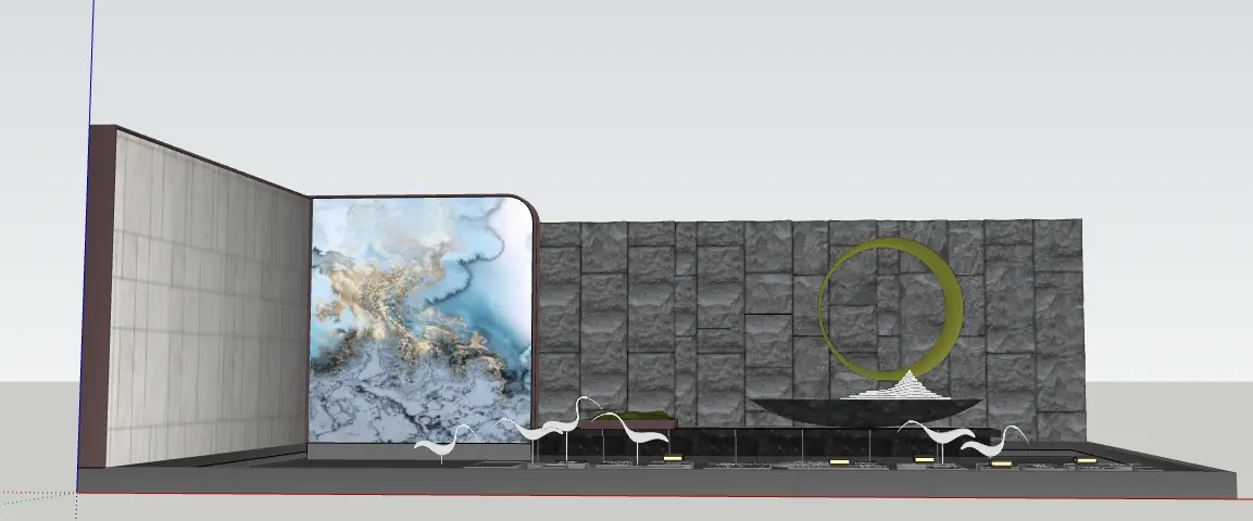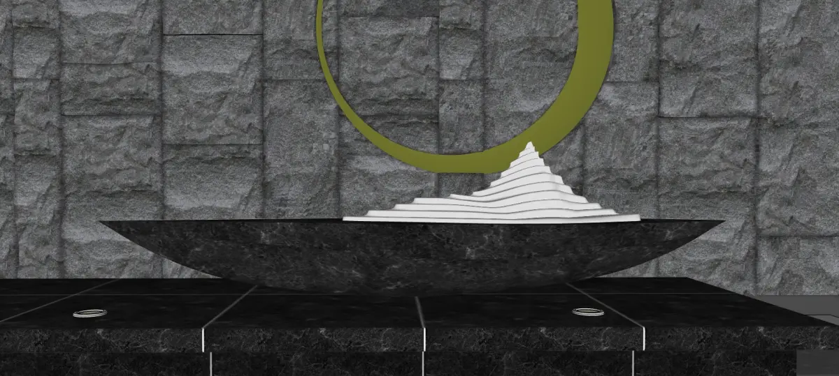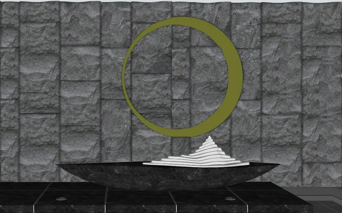 This evocative landscape wall design masterfully blends contemporary minimalism with profound Chinese artistic traditions. The focal point features a sculptural, jet-black textured rock wall with dynamic undulations, juxtaposed against a neutral off-white real stone paint side cladding. A graceful crescent moon light strip casts ambient illumination, enhancing the tranquil atmosphere. At its base, a sleek boat-shaped fountain emerges from reflective water, accented by elegant crane sculptures and subtle engraved stone steps featuring artistic Chinese characters. A small, contemplative ink-wash style artwork nestles in the corner, deepening the spatial poetry. Dominated by a timeless black, white, and gray palette, the composition achieves a powerful yet restrained aesthetic – minimalist in form yet rich in cultural resonance. Every element (rock, water, light, flora symbolism, and calligraphy) converges to create a harmonious, Zen-inspired statement piece perfect for gardens, courtyards, or upscale commercial spaces seeking timeless elegance and cultural depth.