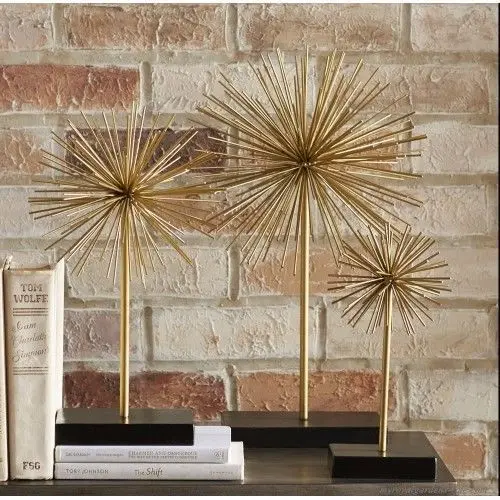 Set of three industrial arts tin wire stardust sculptures, gold finish cut off wires arranged around small center ball, mounted on iron posts to black flat rectangular bases.