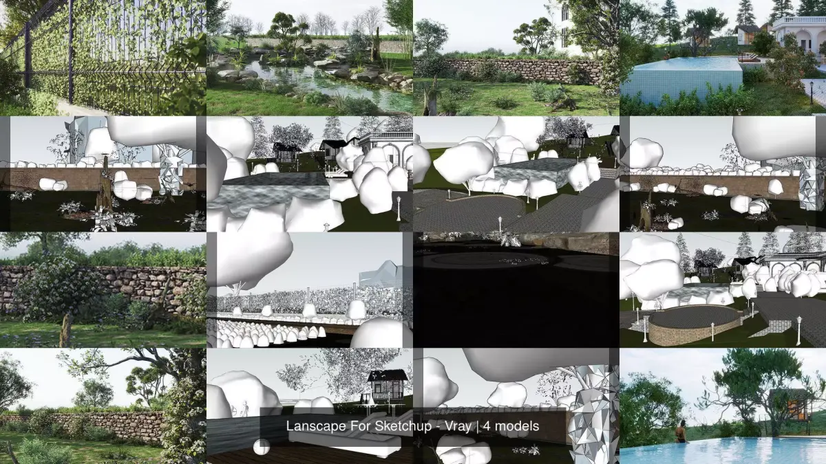 This is a fully textures - lighting - proxy Lanscape with light setup, ready to render with SKETCHUP AND VRAY 6. This file does not have any type of protection. You can reuse the scene, the render settings, the lights, the materials, but above all you can learn from the file. Full file Sketchup, Render by vray 6, Full textures - lighting - proxy for beginner sketchup and vray. Enjoy it!!!