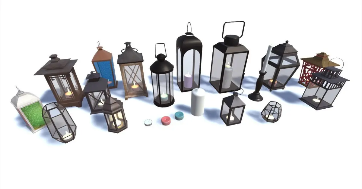 Collection of 23 different lanterns and candles originally created for Unity. They are all metal and glass. There are also the FBX models included separately, textures included, to be used in other 3D apps. This low poly scene is ideal for games or applications.