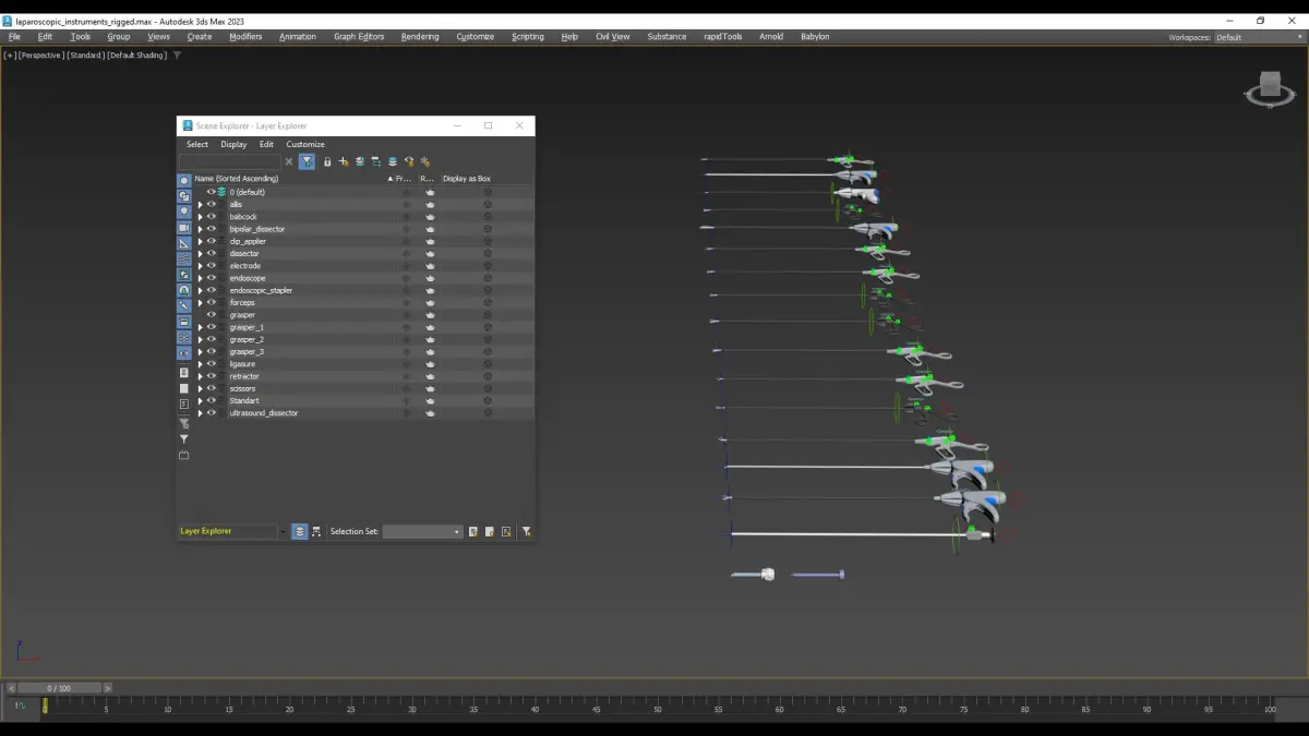 All instruments are now rigged. You can animate instrument branches, handles, adjust position of trocar and axial rotation.