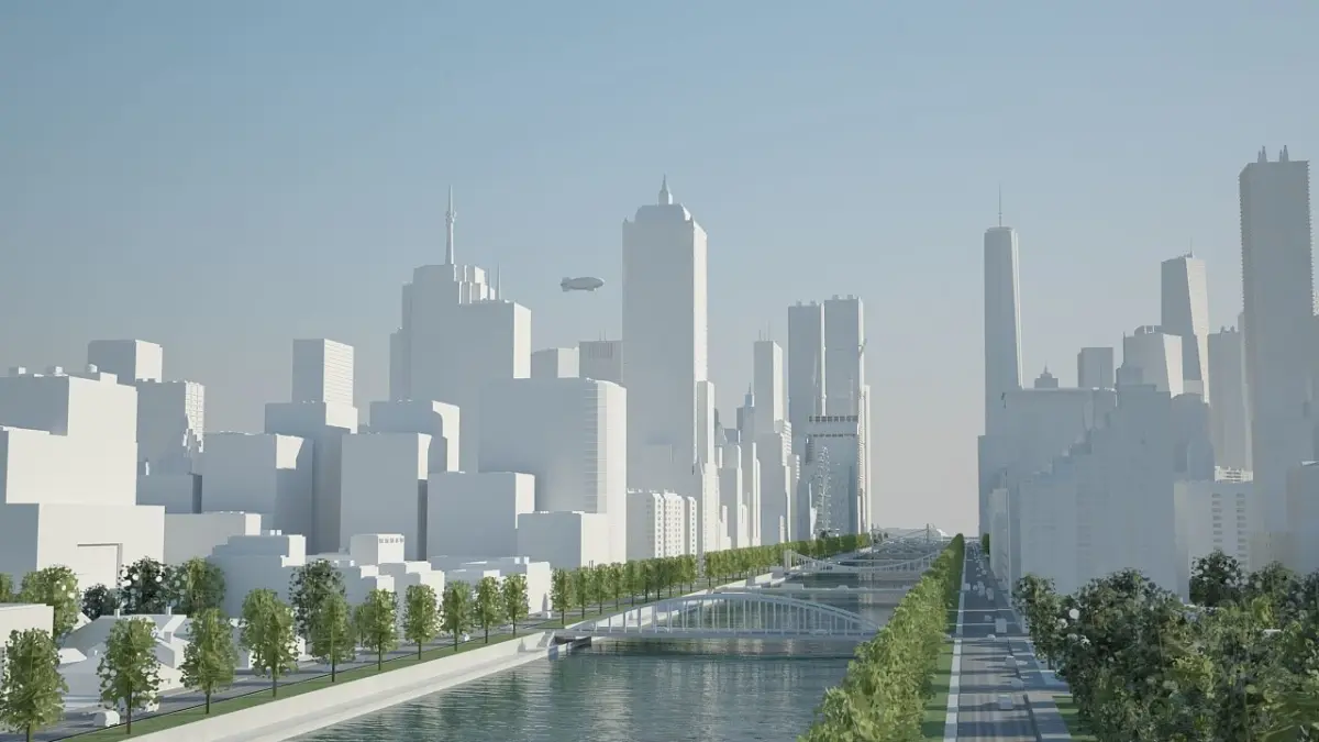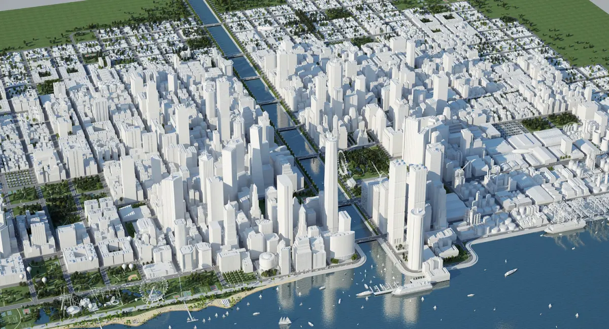 All white buildings, but trees, grass, sport fields and roads have textures.Looks like New York, Chicago, Los Angeles, and other big American cities, but its not a clone of them.Simple clean and crisp, very usefull for a large variety of projects.