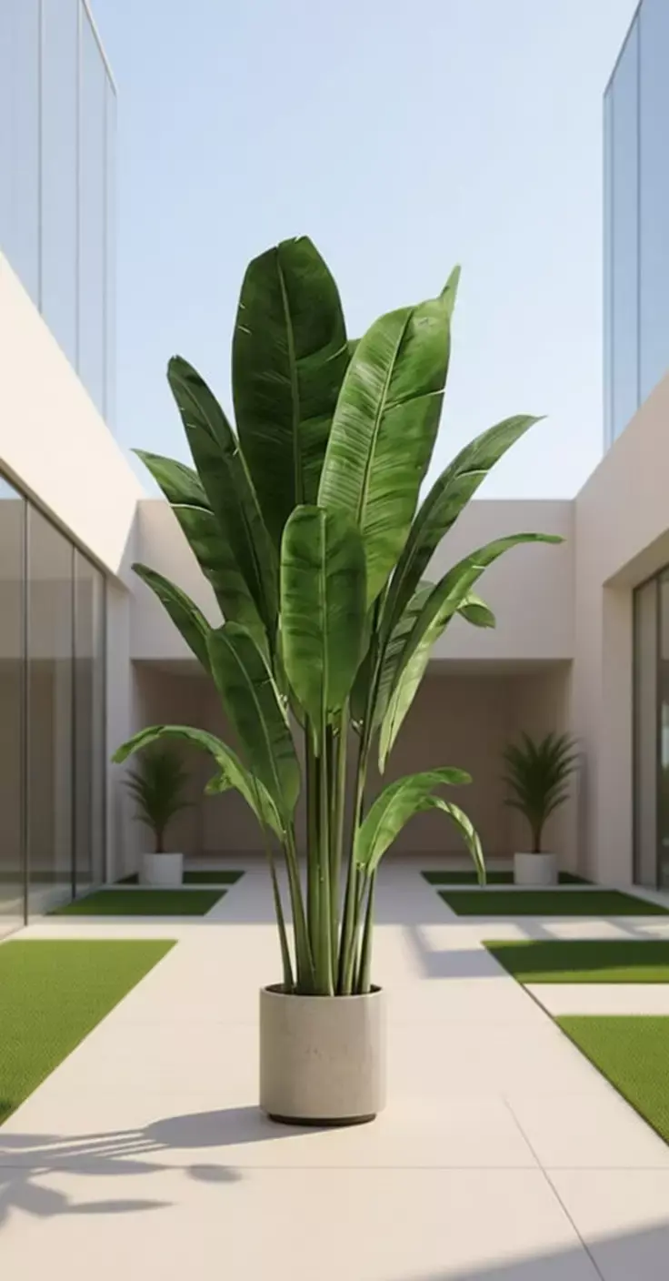 The model includes multiple high-resolution PBR materials with albedo, roughness, normal, and metallic maps that simulate the glossy surface of real banana leaves under various lighting conditions. The gray concrete-style pot is modeled with fine surface details such as texture grain and subtle imperfections, enhancing the overall authenticity and modern aesthetic. Both the plant and pot are optimized for high-quality rendering in Blender, Maya, 3ds Max, Cinema 4D, and other professional 3D software platforms.