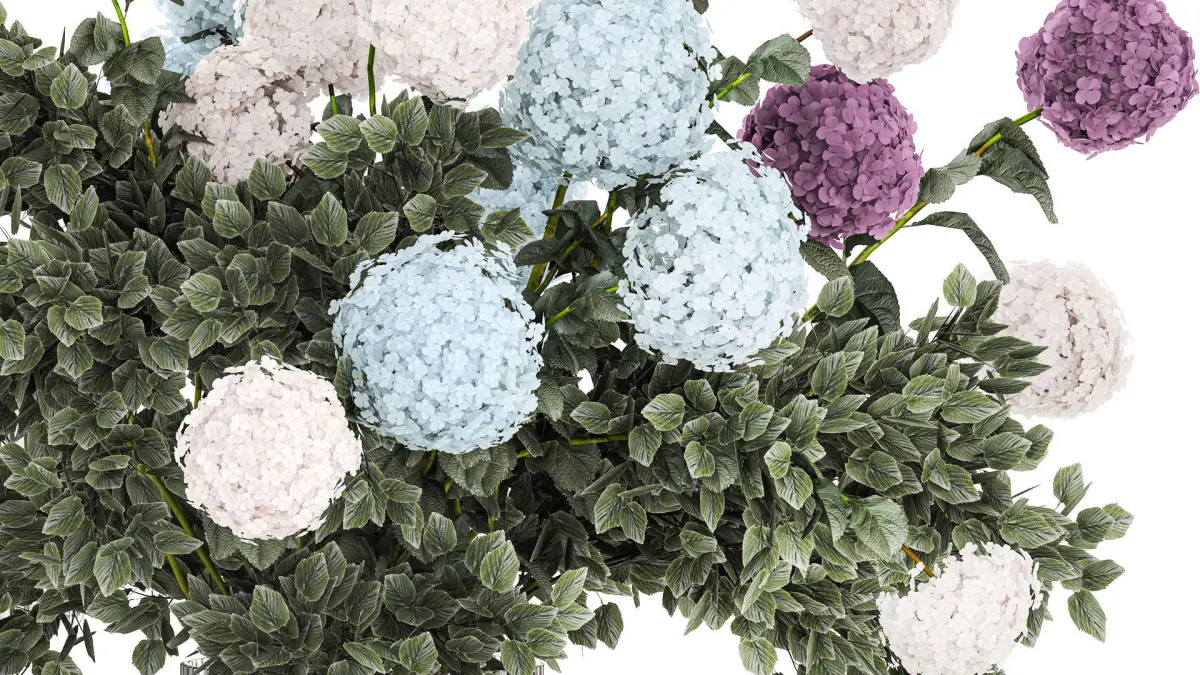 Large bouquet of flowers and greenery blue white hydrangea