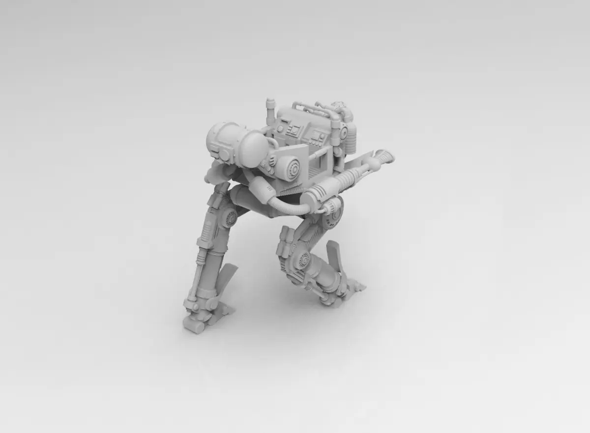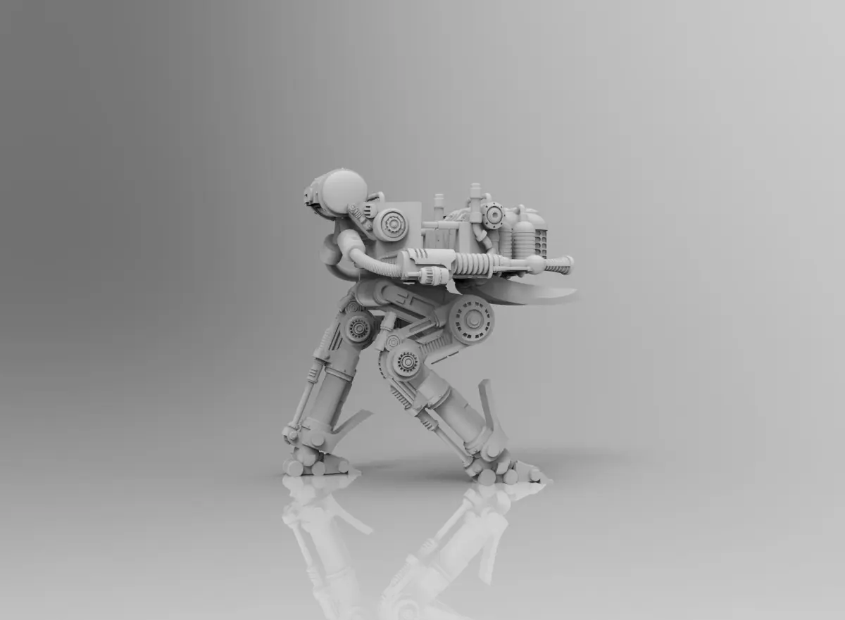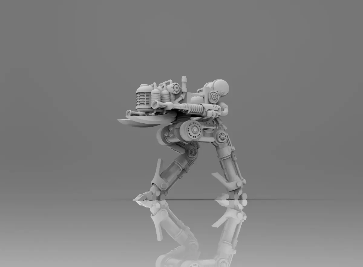 A weaponized agricultural walker, equipped with two large chem throwers. Perfect for post-apocalyptic and dark future tabletop games.
