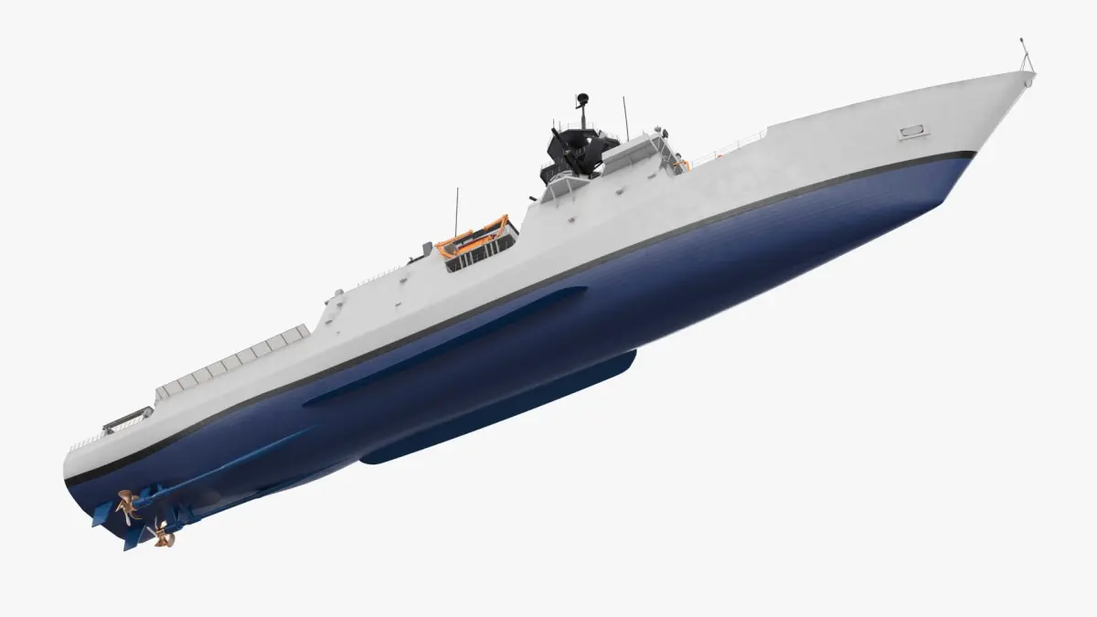 The ship is equipped with a spacious helipad on its deck, capable of accommodating helicopters for efficient transport and rescue missions. Below the deck, the model showcases a well-structured garage area fitted with cranes and storage for small boats or equipment, enhancing its operational capabilities. Its sleek design and advanced features make it suitable for various naval and maritime purposes.