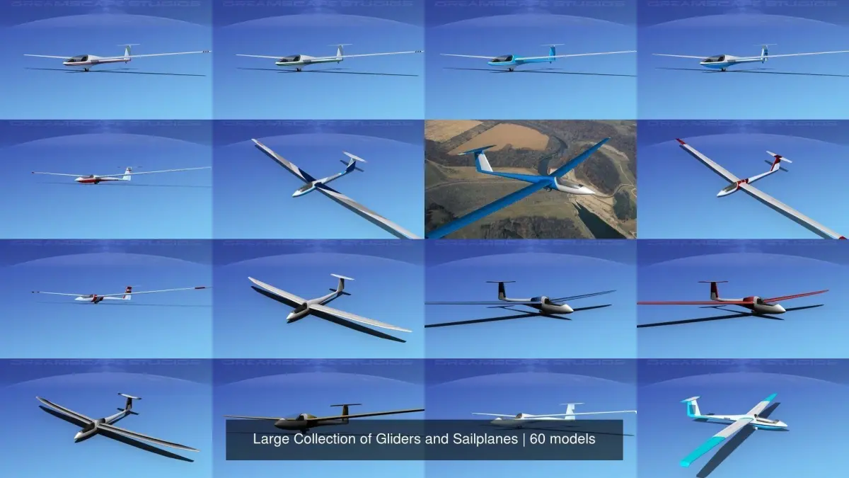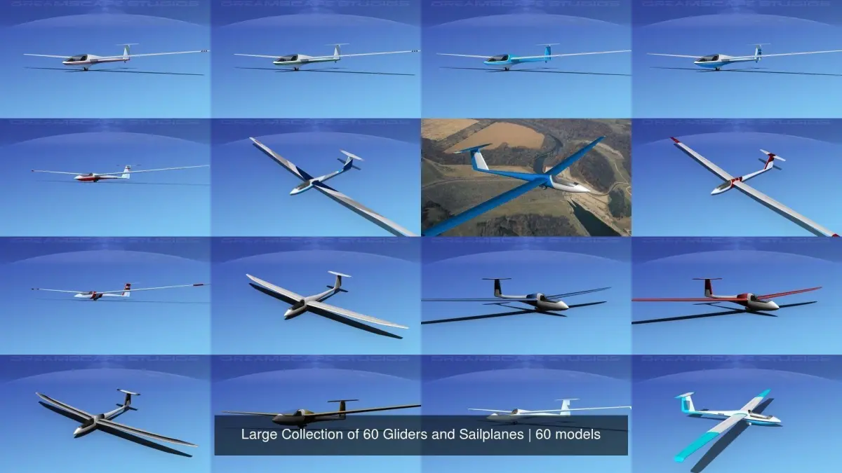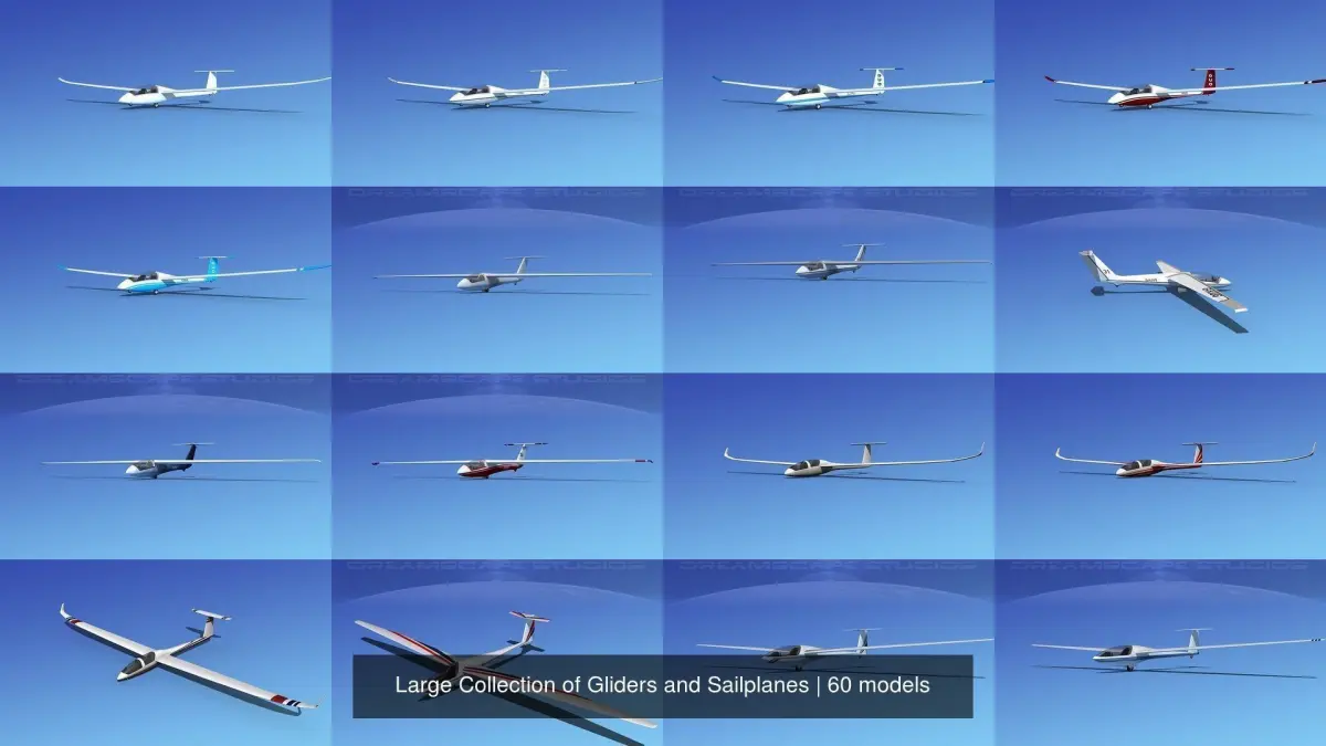 The very large collection of 60 sailplanes and gliders is created near to scale (within 5%) according to the real reference. Native format is 3ds Max. Models are exported to a wide variety of formats. Other formats are exported in one resolution. This can be further subdivided. Exported formats (3ds, lwo and obj) are prepared well to work correctly with every standard modeling software. Compatibility level with other software’s may be limited. Textures are included with all files. The model is built to be used in in-flight animations and video or simulation. It can also be used to populate an airport scene. Previews were rendered using 3dsmax standard scanline. SZD-36 and SZD-31 have some interior features that can be viewed from the exterior, the canopy can be opened to reveal a good semi detailed cockpit and cabin seating. Models have animateable control surfaces including ailerons, rudder and elevators. Glaser-Dirks have also detailed cockpit. The canopy can be opened. The ailerons, elevator, and rudder are animateable. We also have introduced a set of standard wing tips installed and extra winglet wing tips in the event you would like to use them. Letov Superblaniks and Duo Discus also include animateable control surfaces ailerons, elevators and rudder. The canopy opens to reveal a fairly detailed cockpit with modeled and textured instrument suite. Schleicher ASW 22 is really smooth and geometrically fairly detailed. It looks great in animations of flight. The model includes a canopy that opens and a basic cockpit. It has animateable landing gear, landing gear door, ailerons, rudder and elevators. Ventures include animateable control surfaces, ailerons, spoilers, elevators, and rudder, canopy and wheels, it has a moderately geometrically detailed cockpit and exterior detail that make it a good in flight animations subject.