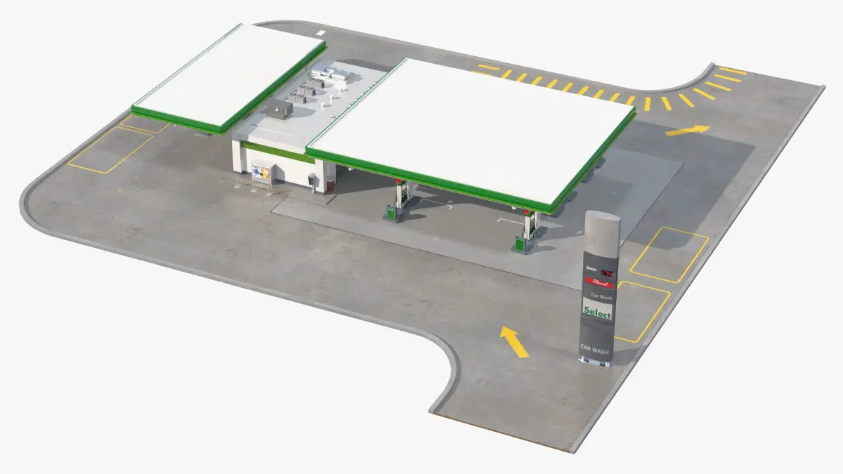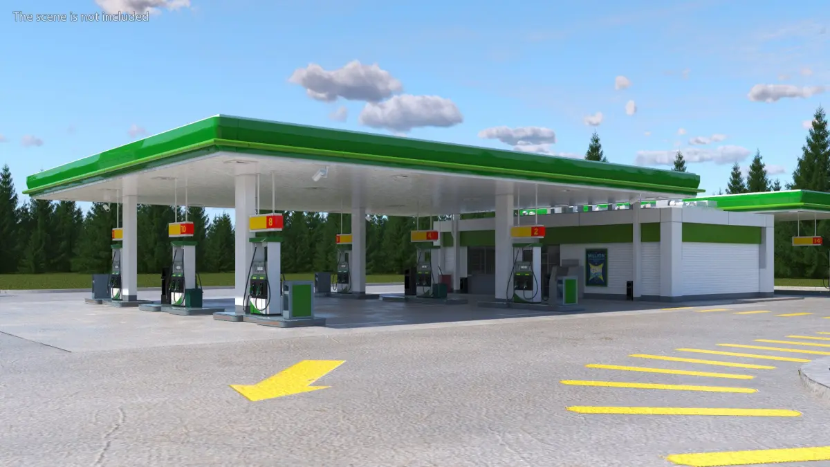 Large Filling Station Green is a 3D model of petrol station, also known as a filling station or gas station, which is a fuel of gas retail outlet.