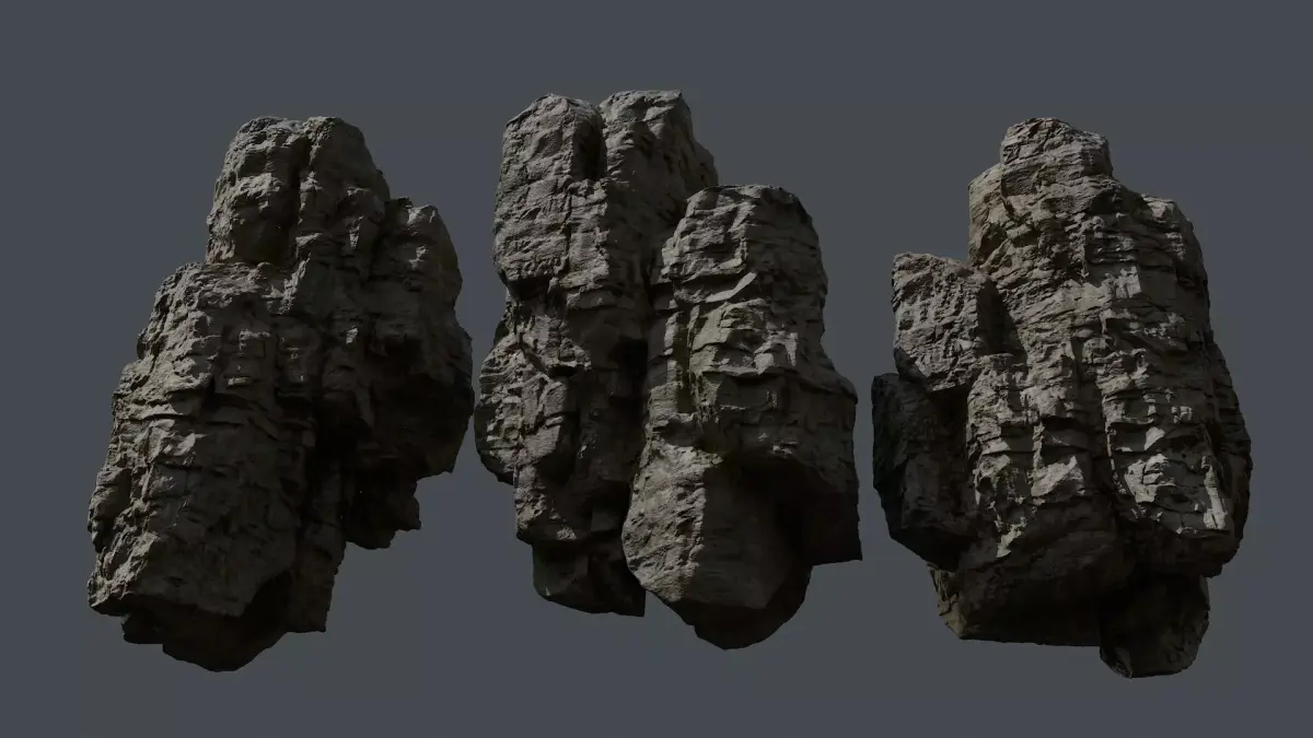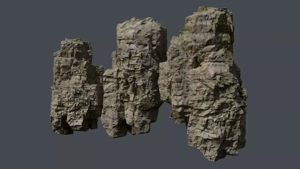These are great props to be used in jungle and desert scenes. Although the detail of the models is large for the size, these are best to be used in medium and distance shots or scenes in games. A closer up renders with player very close to the cliff would require more modular type setup.