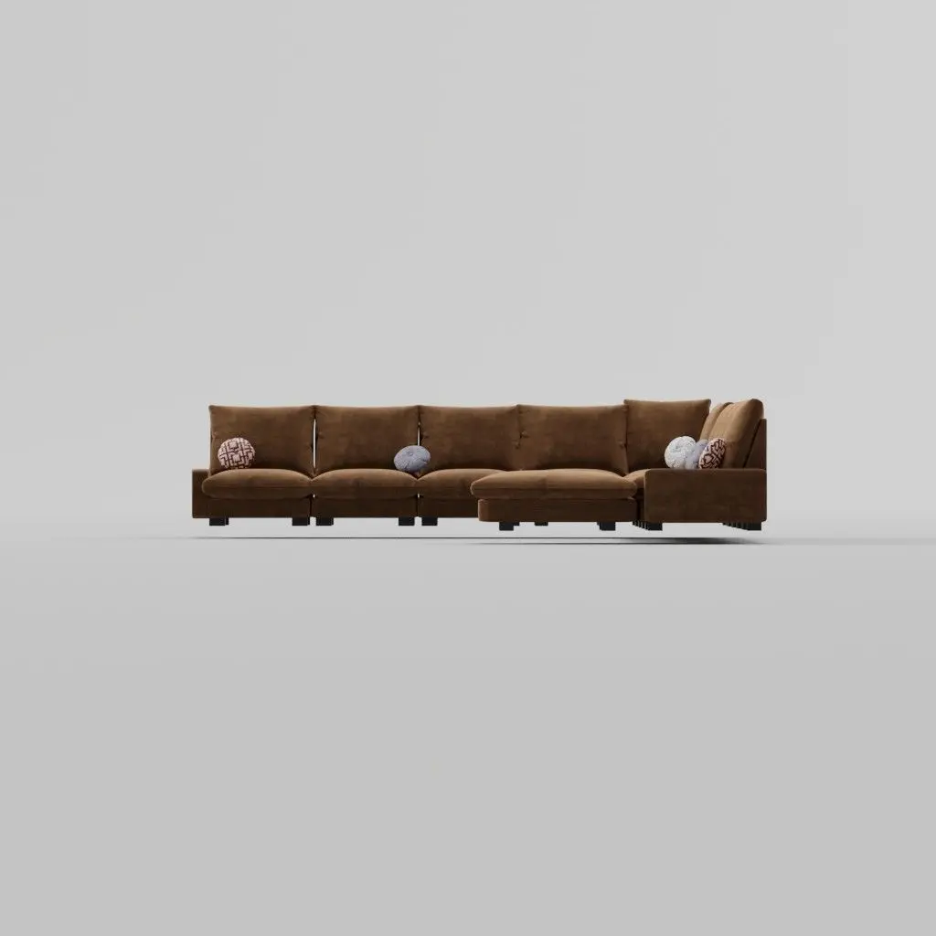 This image showcases a modern, spacious L-shaped sectional sofa adorned with decorative pillows, exemplifying comfort and style suitable for large living spaceshere are the dimensions of the modern brown sectional sofa: